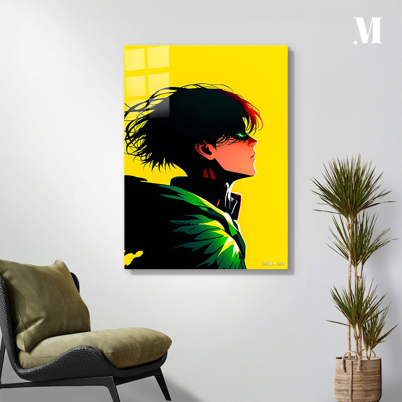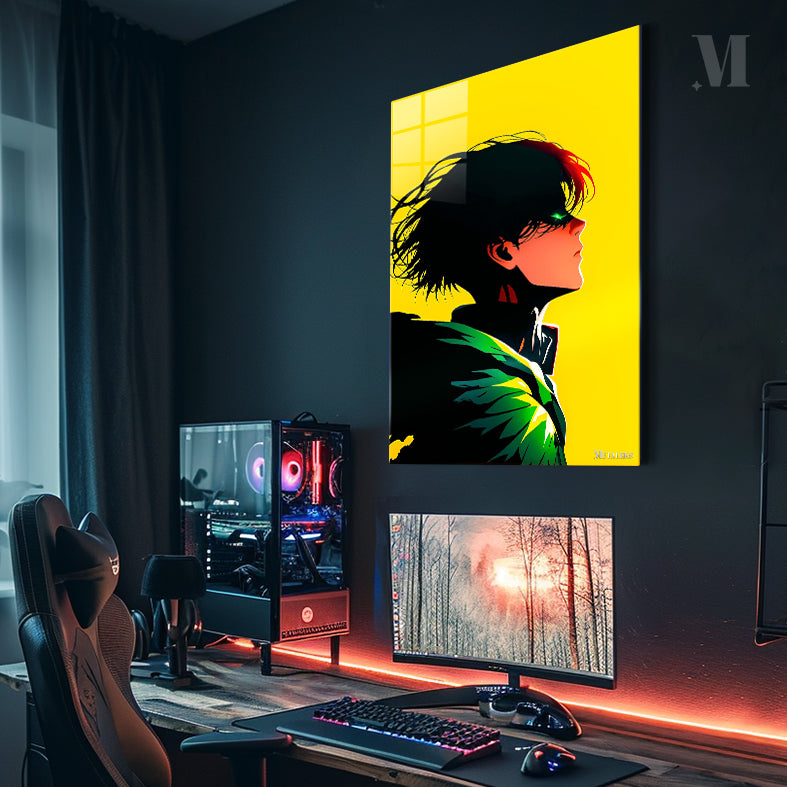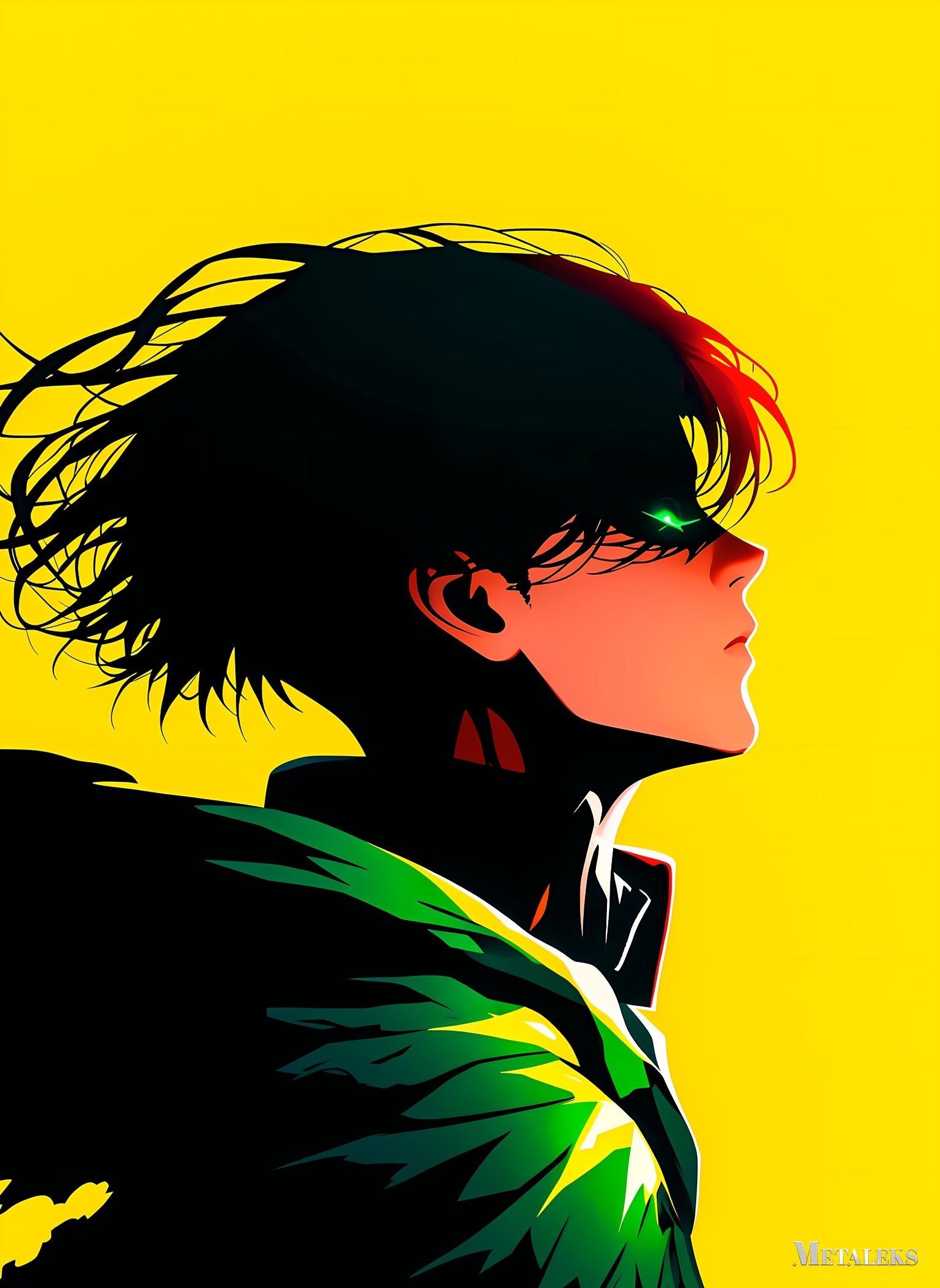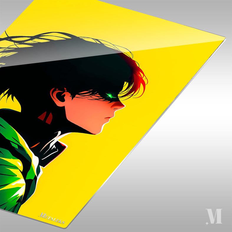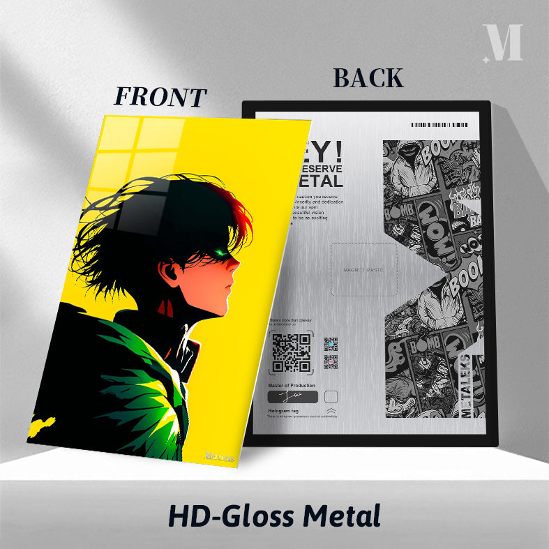 The character in the picture is Izuku Midoriya from “My Hero Academia”. He has short, messy black hair with a few red strands. His hair appears to be blowing in the wind. He has a green eye that is partially visible, and he is wearing a black outfit with a prominent green and yellow design on the shoulder. Metaleks Ultra HD Metal Poster – Create Your Passionate Space.