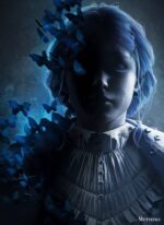 A person with blue hair, wearing a ruffled collar shirt, surrounded by blue butterflies. Metaleks Ultra HD Metal Poster – Create Your Passionate Space.