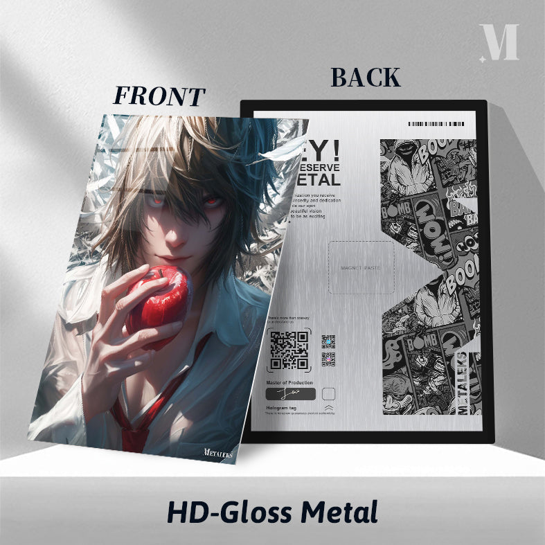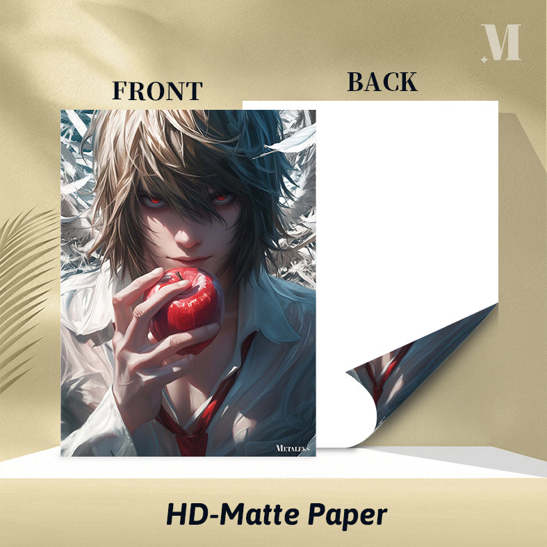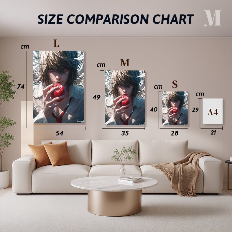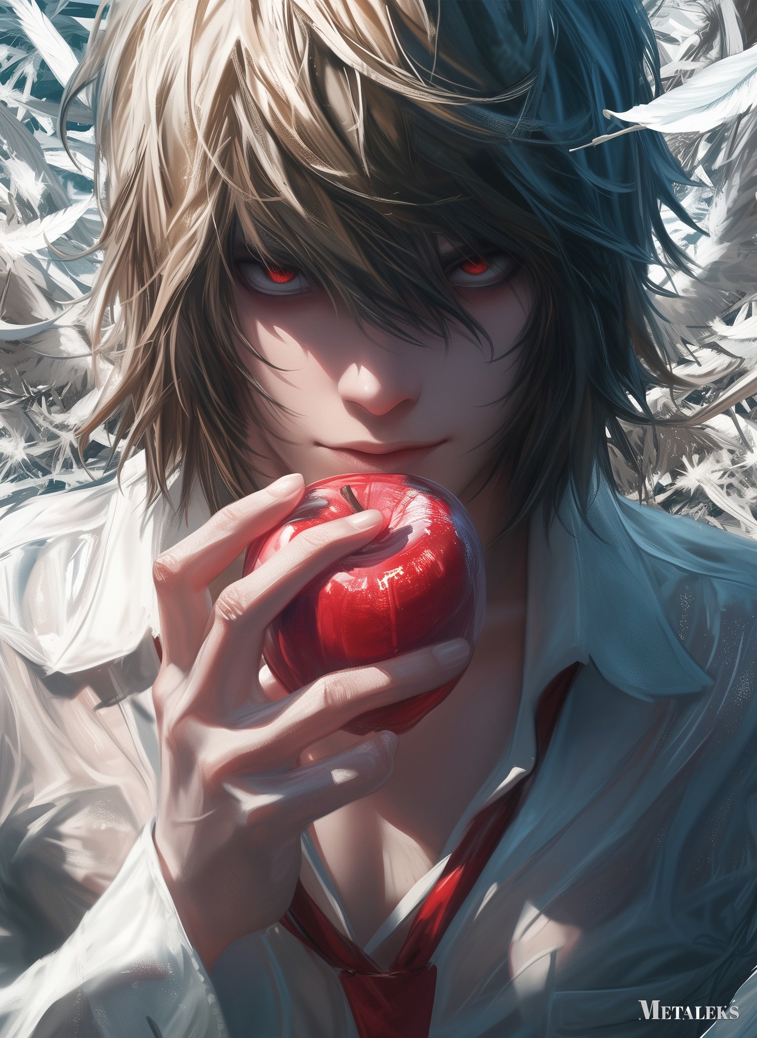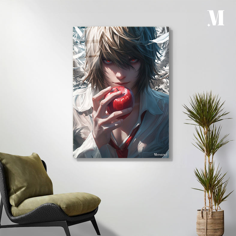 Light Yagami from Death Note is holding a red apple. Metaleks Ultra HD Metal Poster – Create Your Passionate Space.