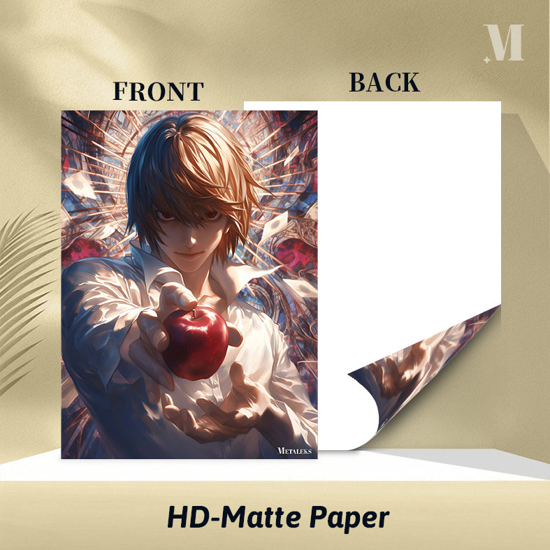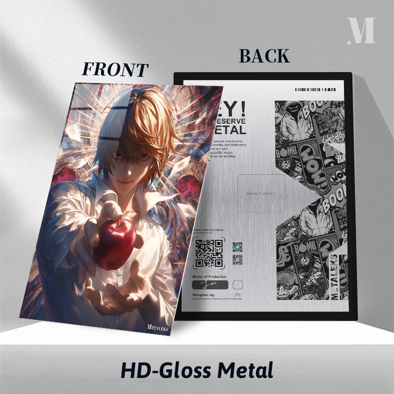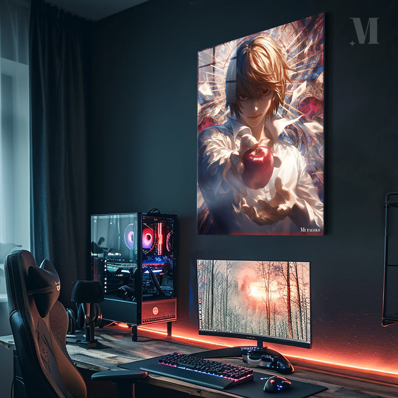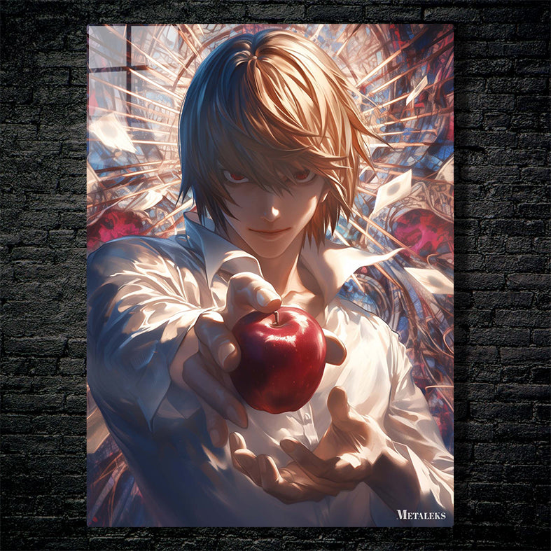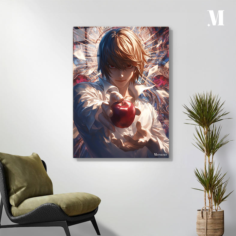 Light Yagami from Death Note is holding a red apple in his hand. Metaleks Ultra HD Metal Poster – Create Your Passionate Space.