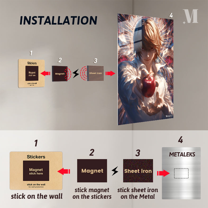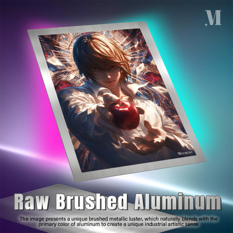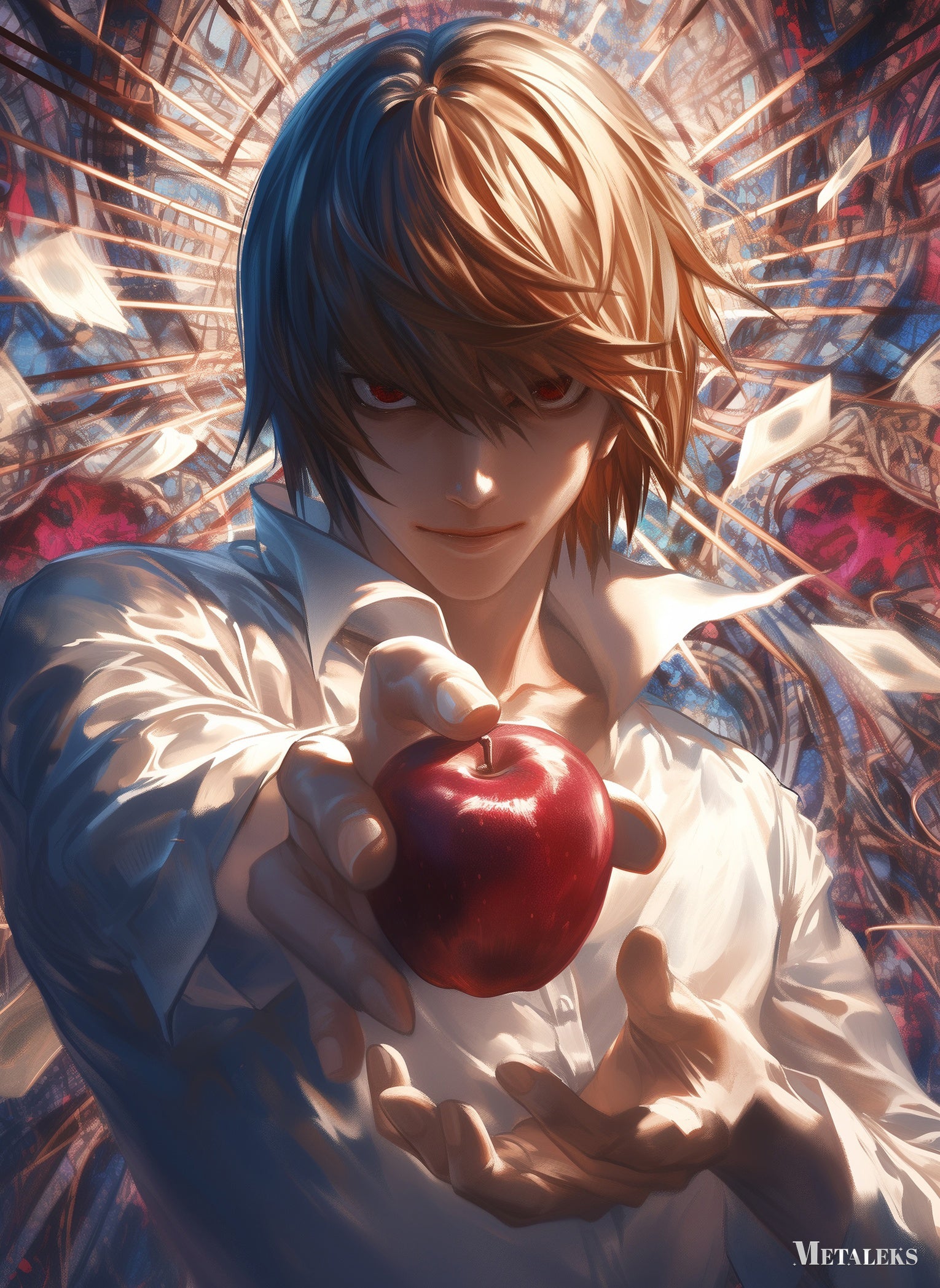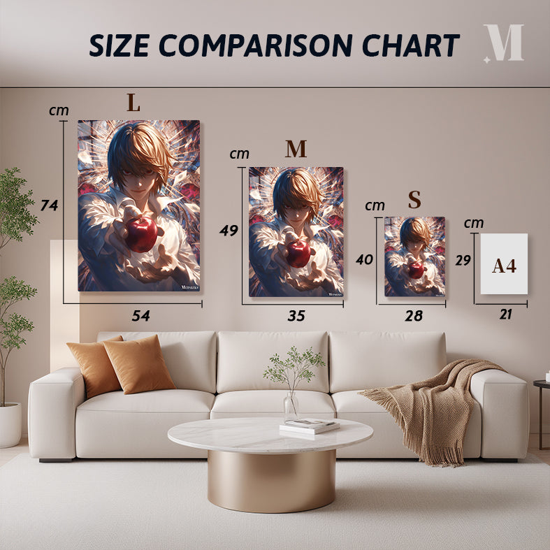 Light Yagami from Death Note is holding a red apple in his hand. Metaleks Ultra HD Metal Poster – Create Your Passionate Space.