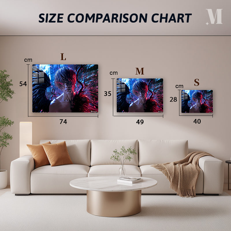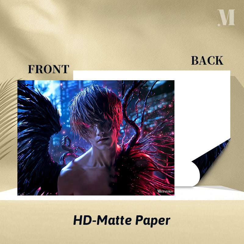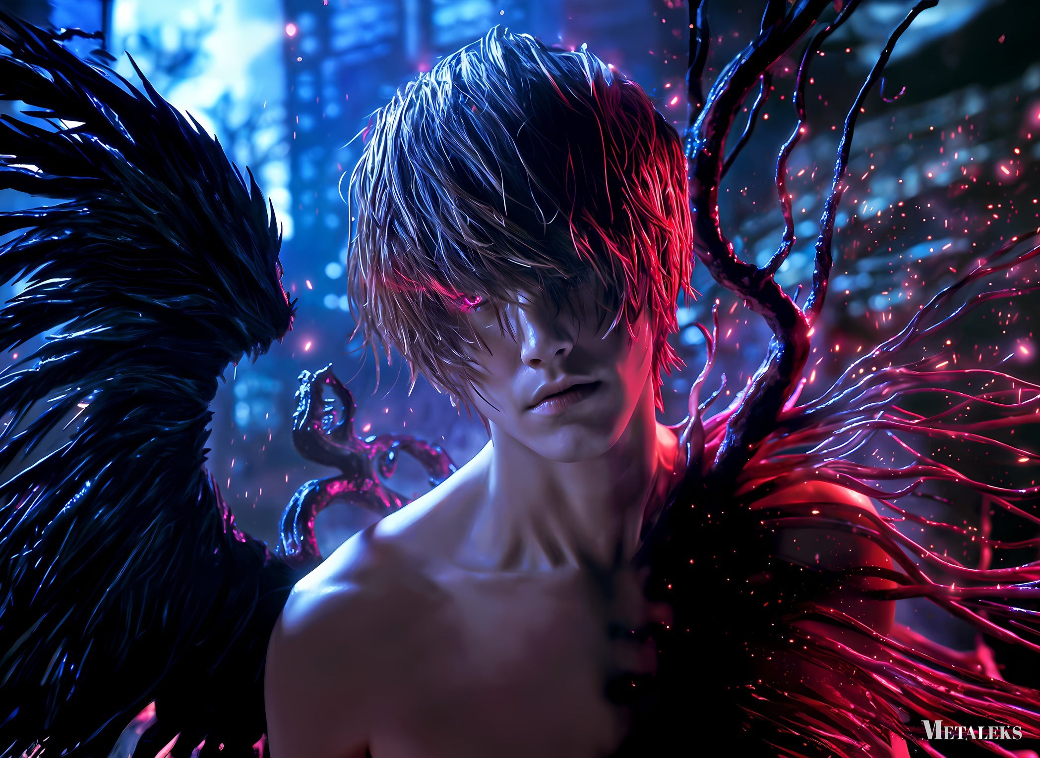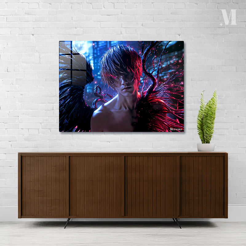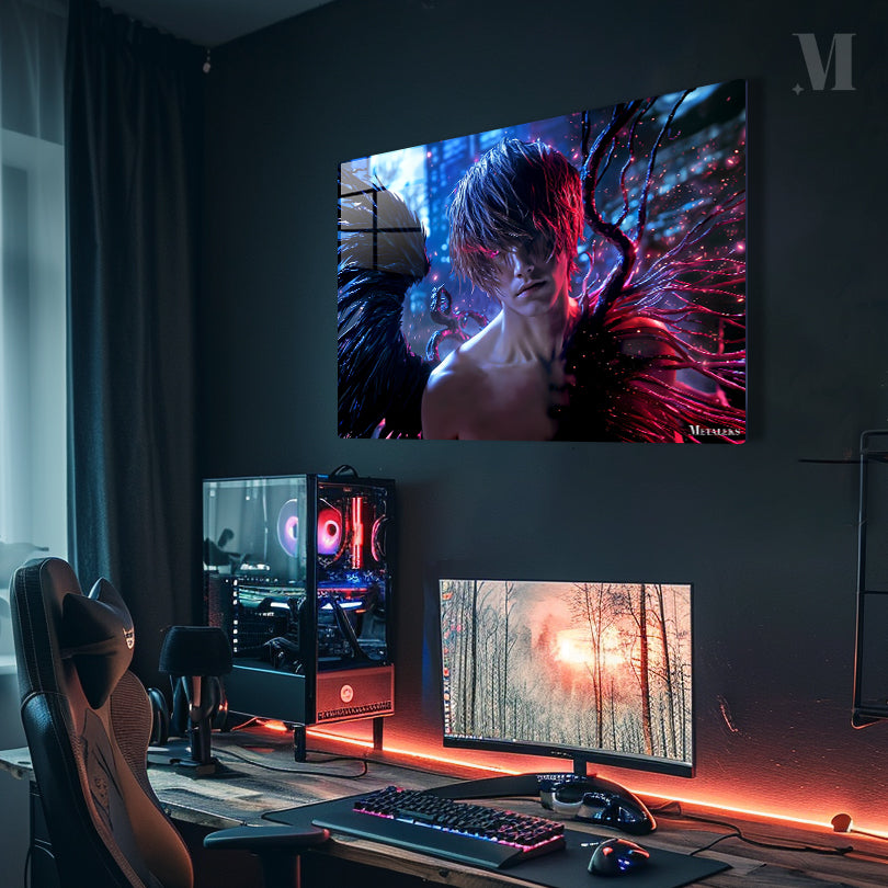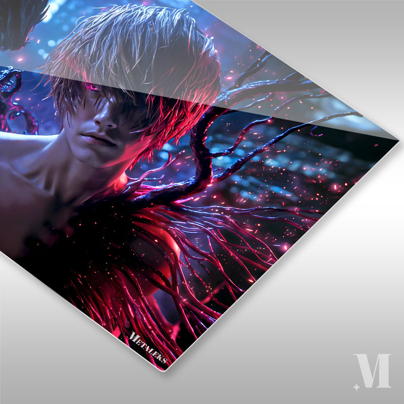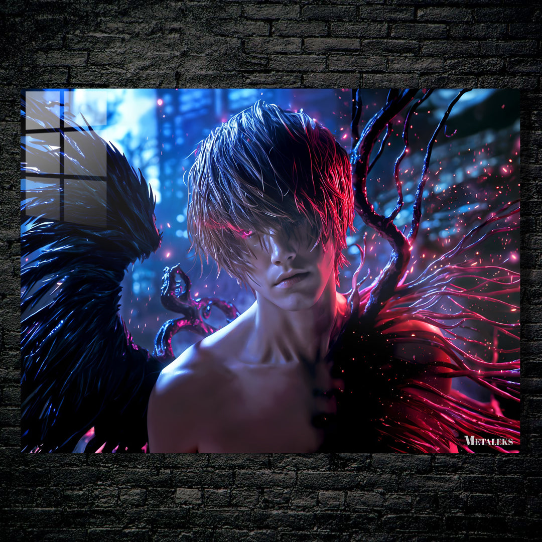 A person with messy hair and glowing red eyes has black wings and a red, tentacle-like appendage on their shoulder. Metaleks Ultra HD Metal Poster – Create Your Passionate Space.