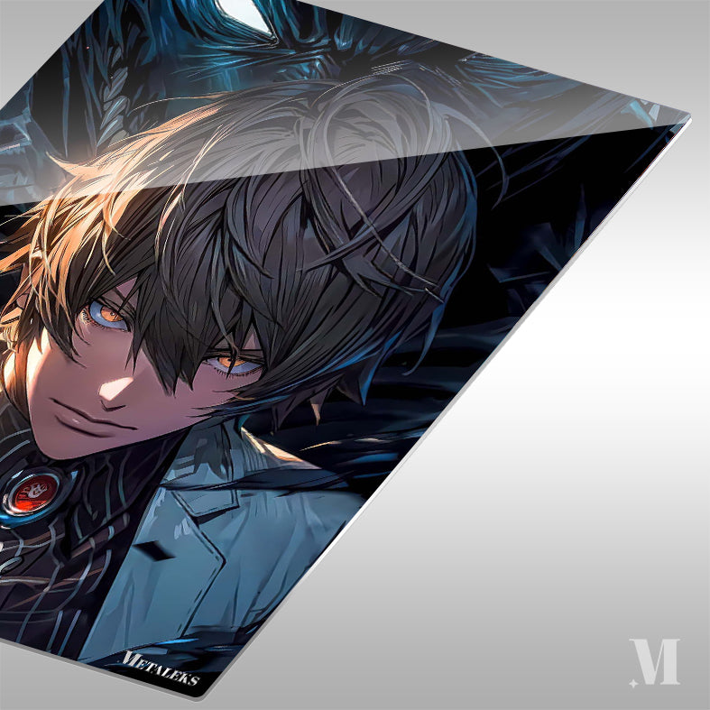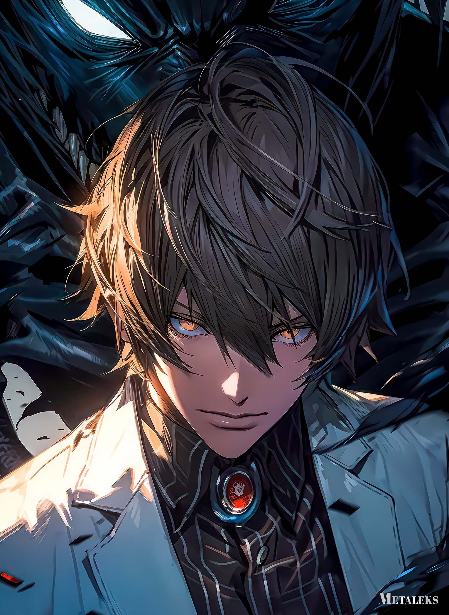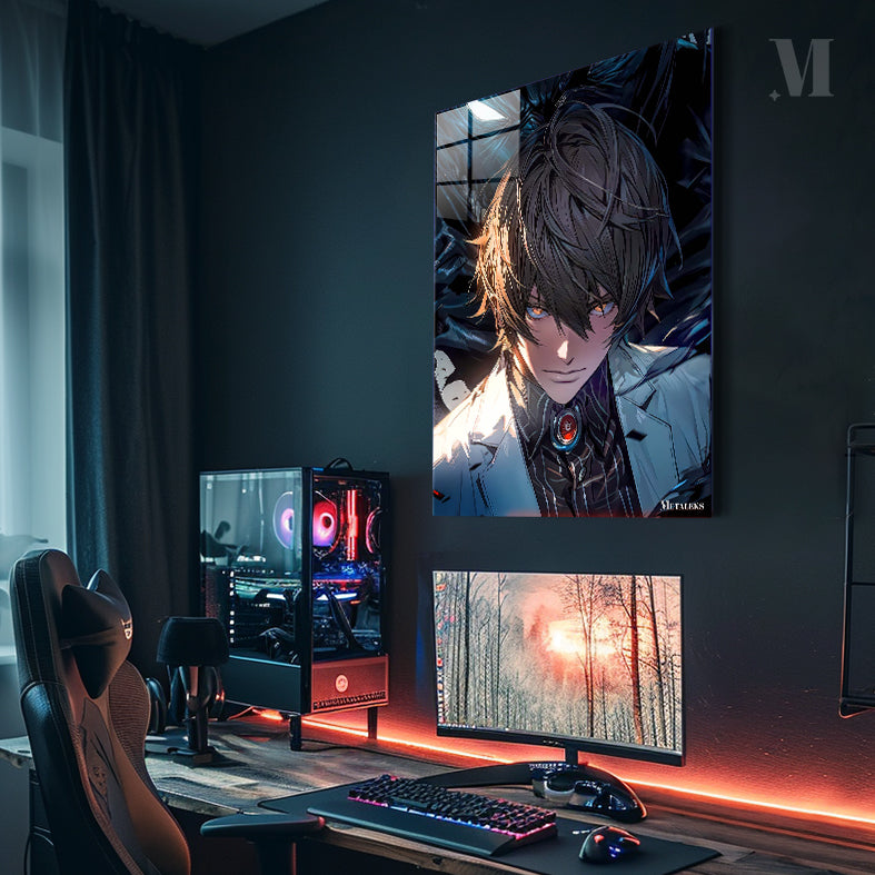 A person with light brown hair and glowing orange eyes, wearing a white coat and a red and black pendant. Metaleks Ultra HD Metal Poster – Create Your Passionate Space.