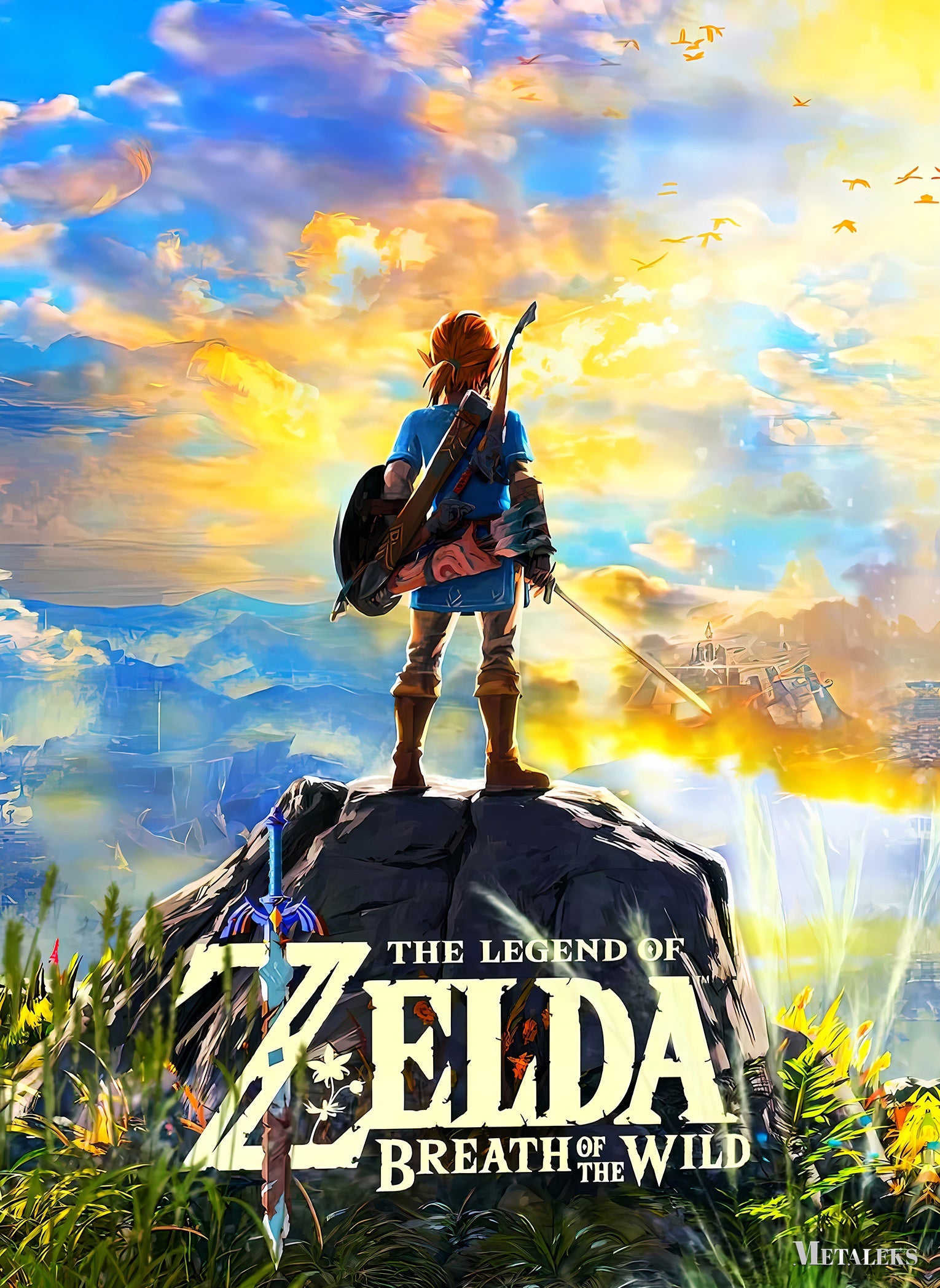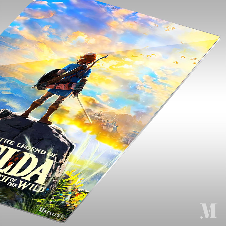 Link from The Legend of Zelda: Breath of the Wild stands on a rock, holding a sword and shield, with a vast landscape and sky in the background. Metaleks Ultra HD Metal Poster – Create Your Passionate Space.
