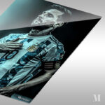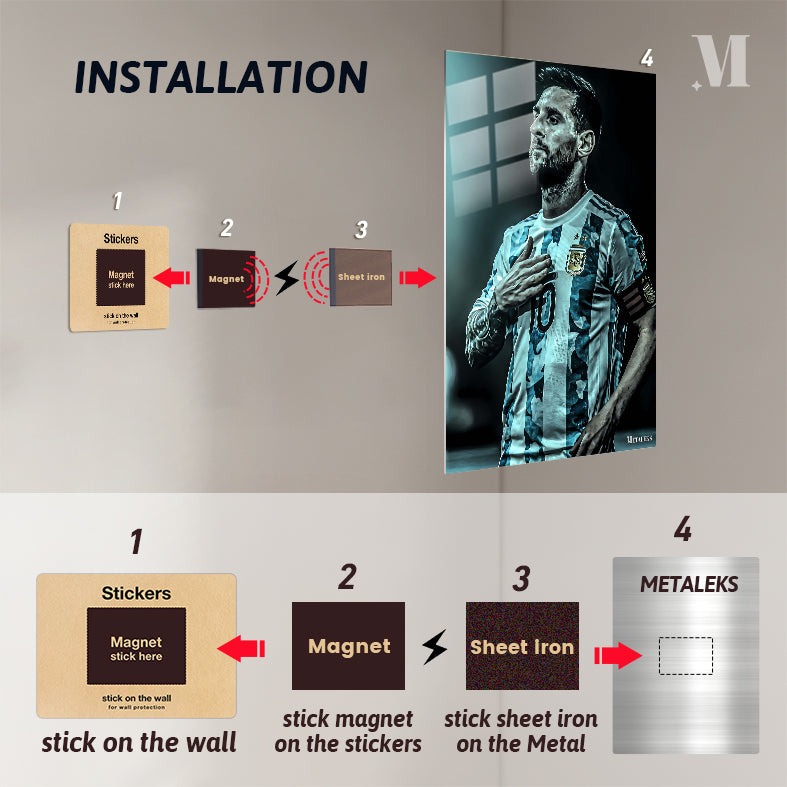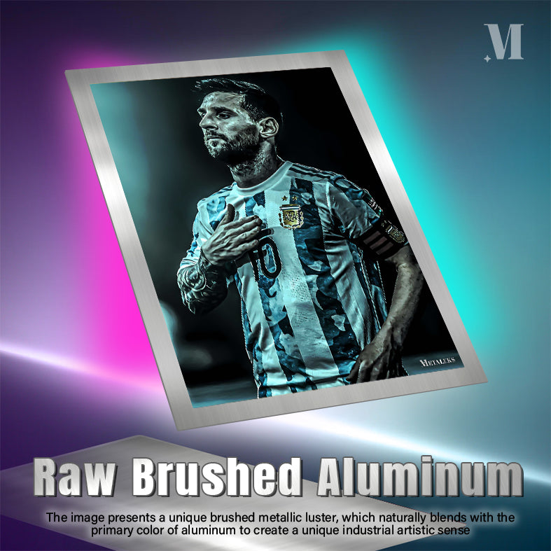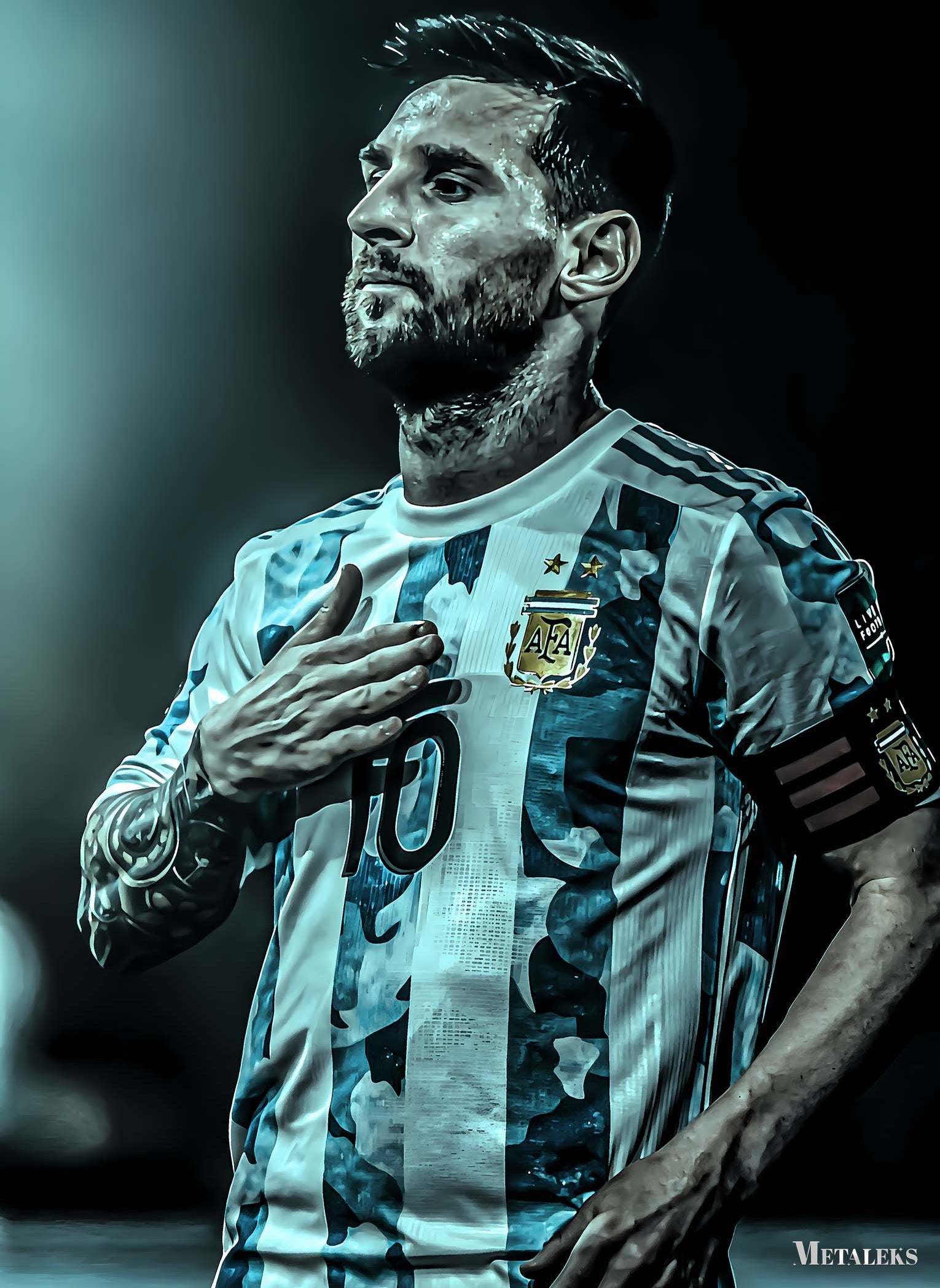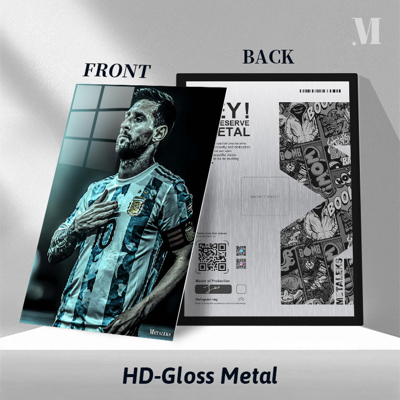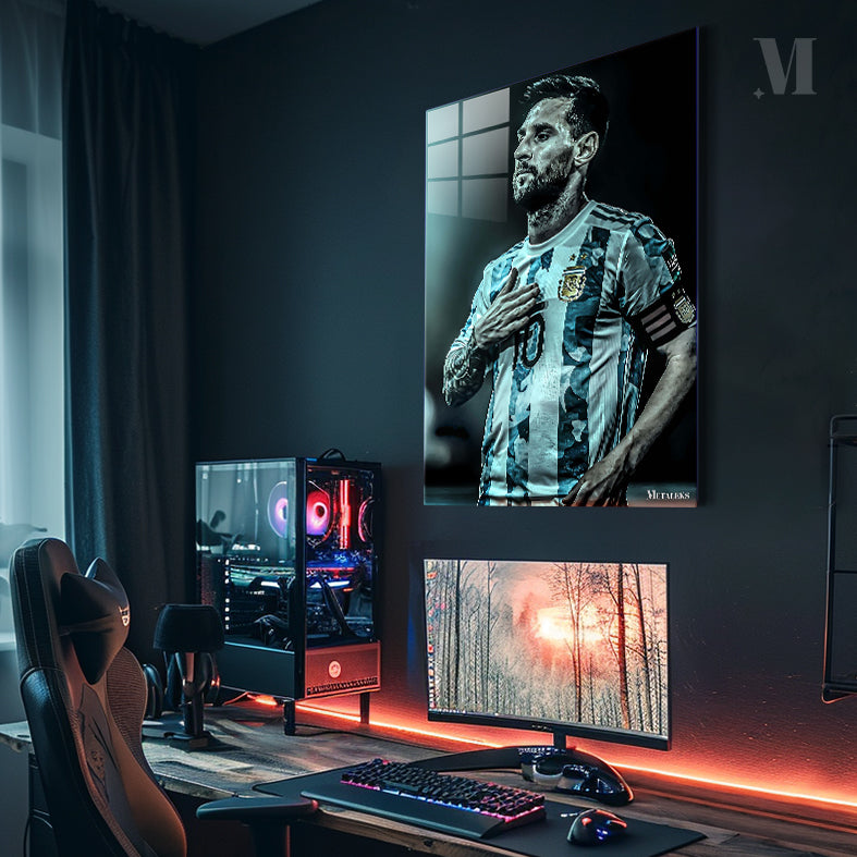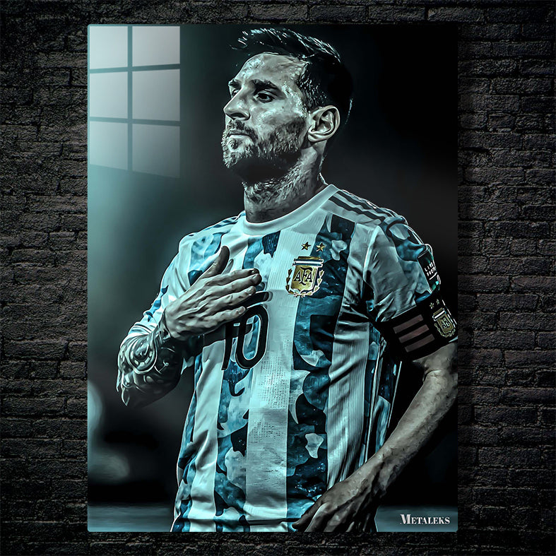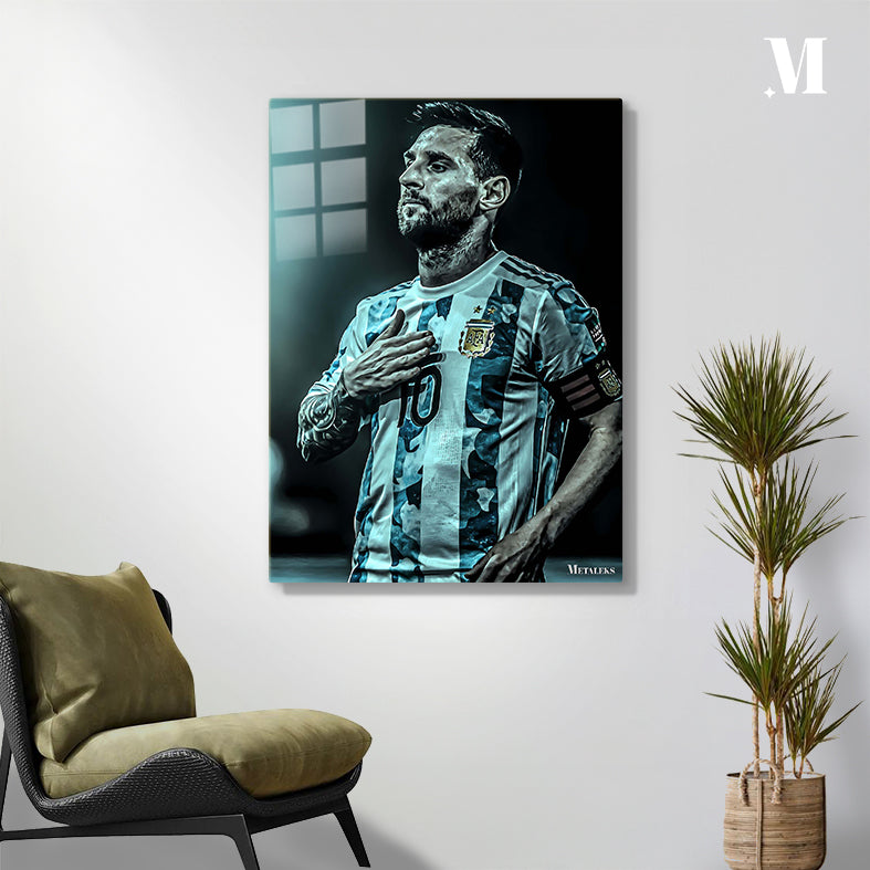 Lionel Messi, wearing an Argentina football jersey with the number 10, places his right hand on his chest. Metaleks Ultra HD Metal Poster – Create Your Passionate Space.