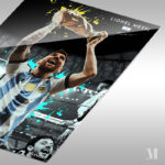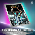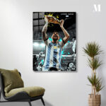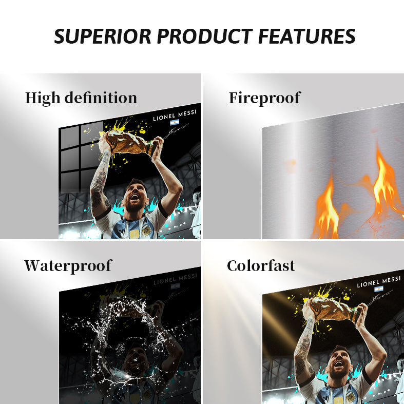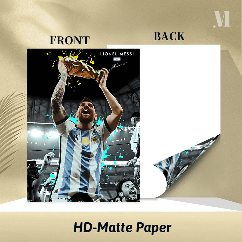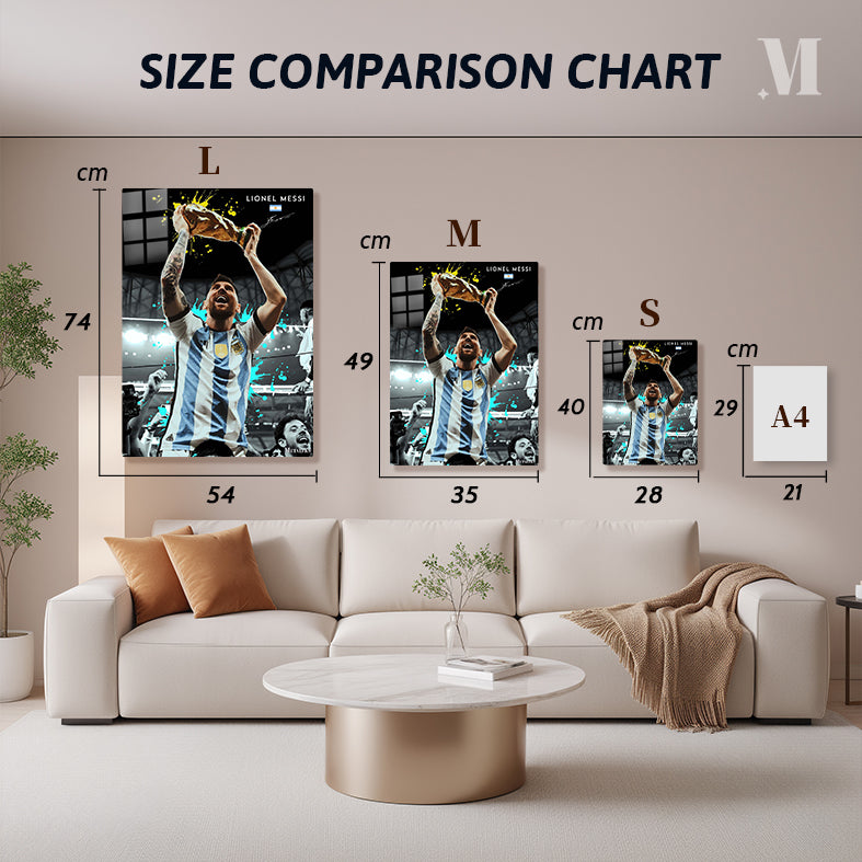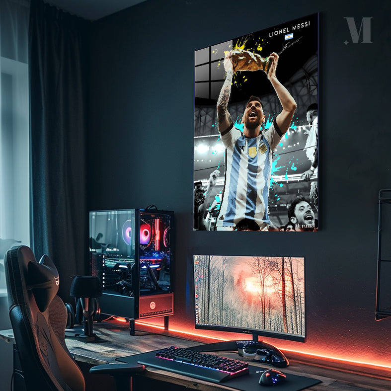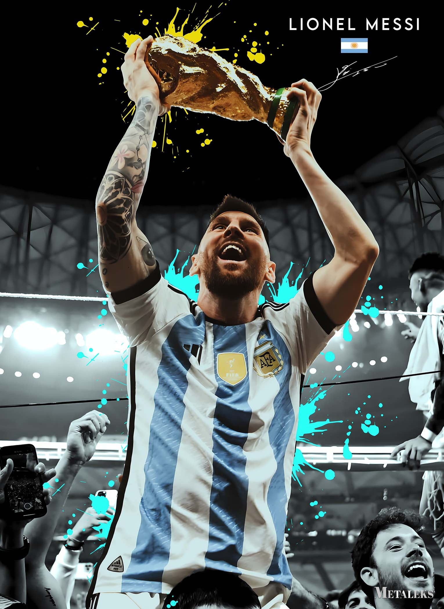 Lionel Messi is holding a trophy aloft. Metaleks Ultra HD Metal Poster – Create Your Passionate Space.