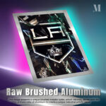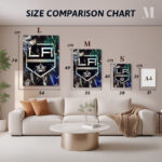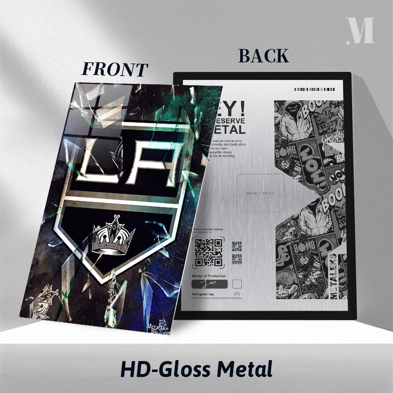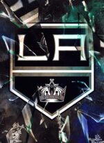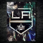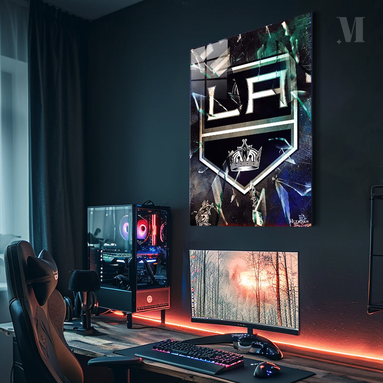 The image features the logo of the Los Angeles Kings, a professional ice hockey team. The logo consists of the letters “LA” in a bold, white font on a black background, with a crown symbol below it. The design is set against a backdrop of shattered glass, adding a dramatic effect to the logo. Metaleks Ultra HD Metal Poster – Create Your Passionate Space.
