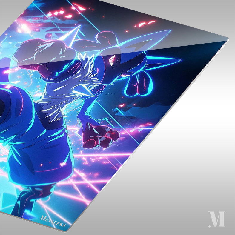 Lucario from Pokemon is in a fighting stance, with one fist forward, ready to strike. The character is outlined in neon blue and pink.