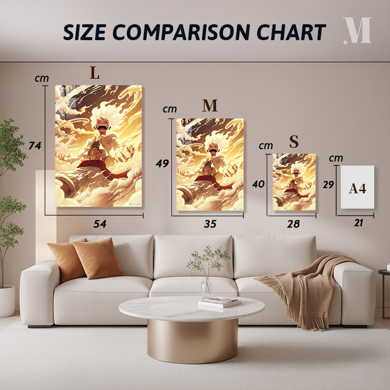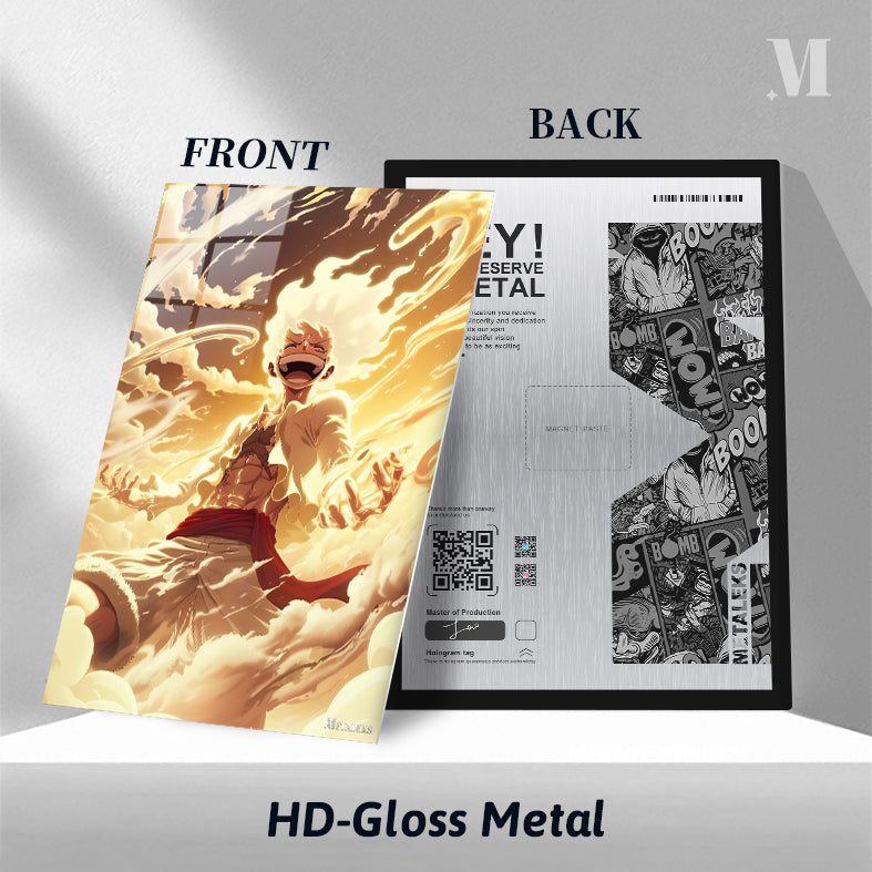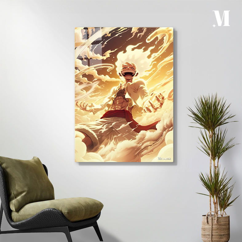 Luffy in One Piece’s Gear 5 form, surrounded by golden, cloud-like energy, with an exuberant expression. Metaleks Ultra HD Metal Poster – Create Your Passionate Space.