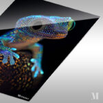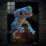 A gecko with vibrant, multicolored skin is perched on a textured surface. Its large, round eye is prominently visible, and its limbs are positioned with its fingers spread out. Metaleks Ultra HD Metal Poster – Create Your Passionate Space.