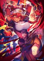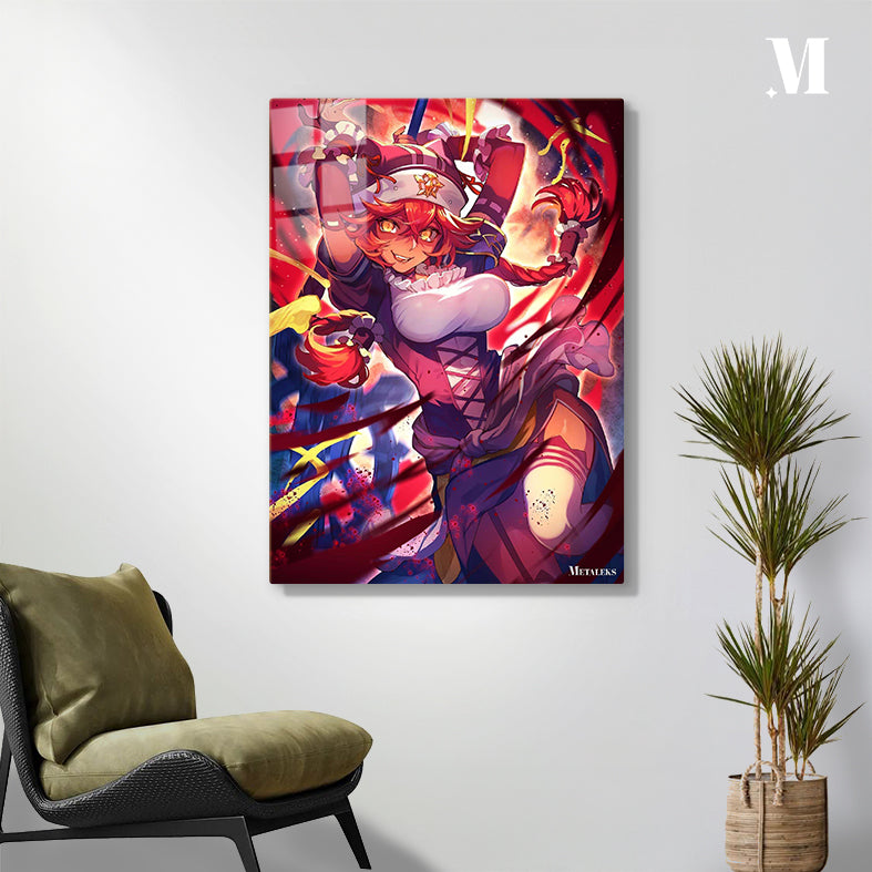 The main subject is Klee from the game Genshin Impact, depicted in an energetic pose with red hair and a distinctive outfit. Metaleks Ultra HD Metal Poster – Create Your Passionate Space.