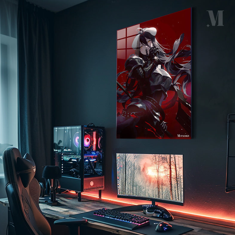 A character with long dark hair and a white headpiece, wearing black armor and holding a weapon. Metaleks Ultra HD Metal Poster – Create Your Passionate Space.