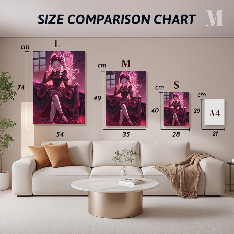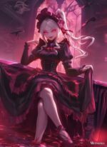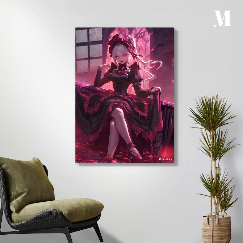 A female character with long white hair tied in a ponytail, wearing a dark red dress with frills and a matching hat. She has glowing pink eyes and is sitting with one leg crossed over the other, holding up her dress. Metaleks Ultra HD Metal Poster – Create Your Passionate Space.