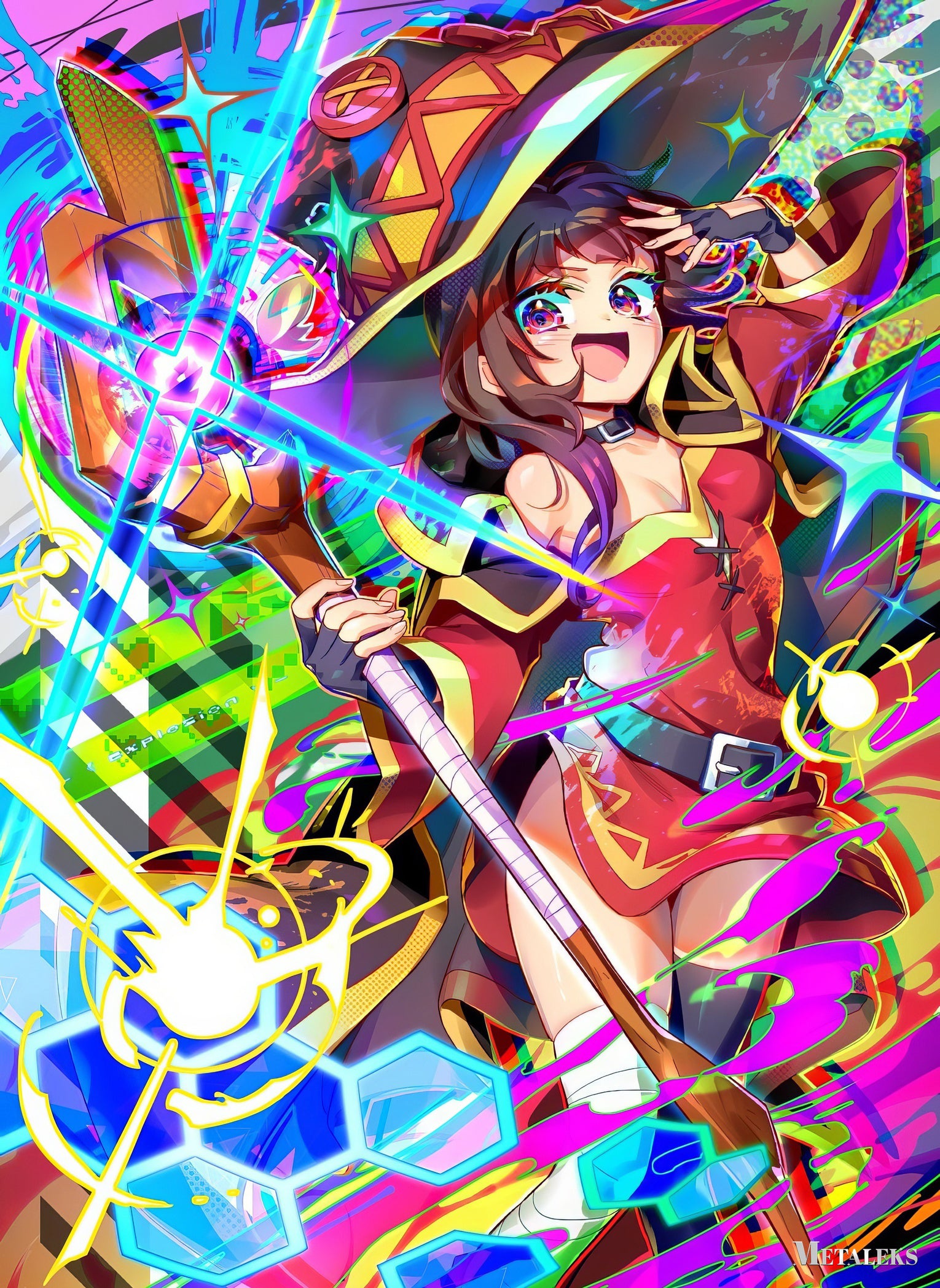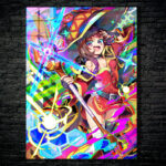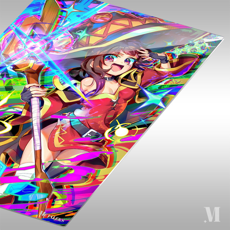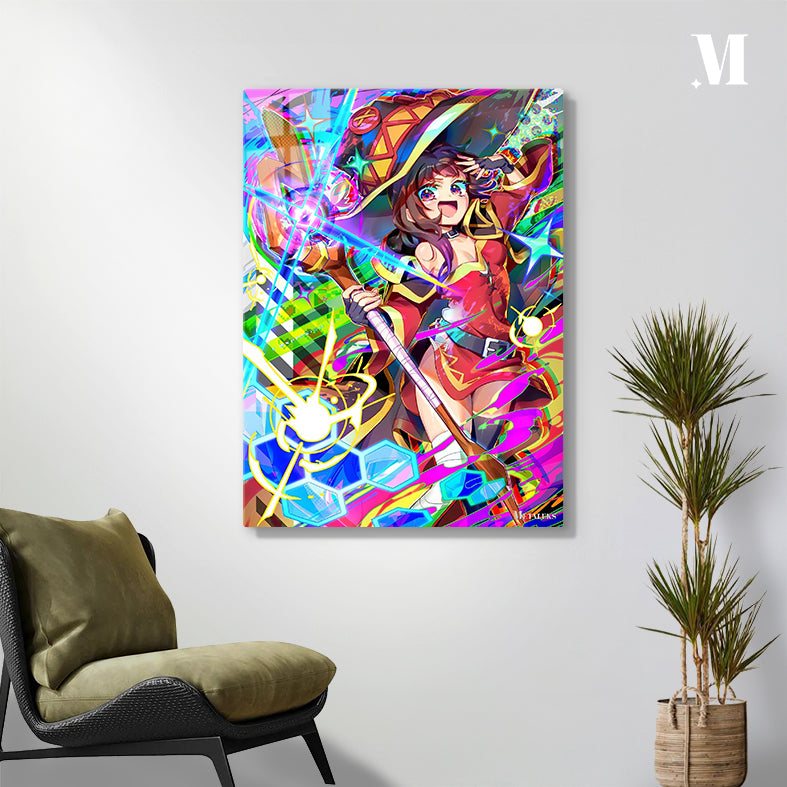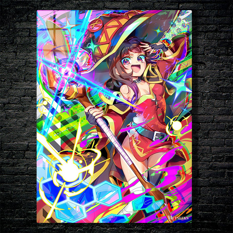 Megumin from the anime “KonoSuba: God’s Blessing on This Wonderful World!” is wearing a red and yellow outfit, a large hat, and holding a staff. She has one hand on her forehead and appears excited. Metaleks Ultra HD Metal Poster – Create Your Passionate Space.