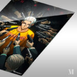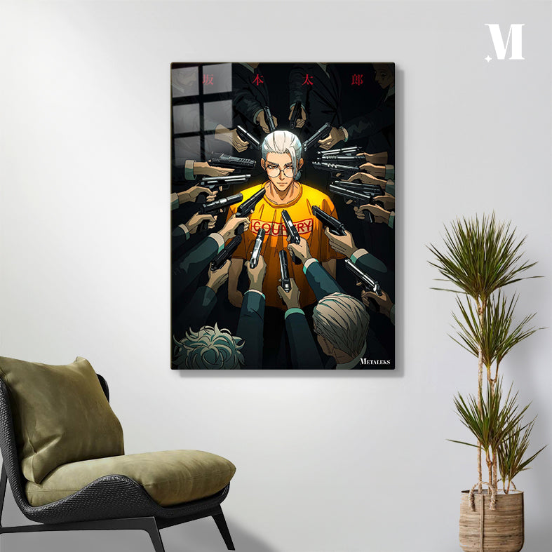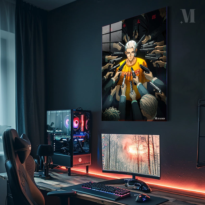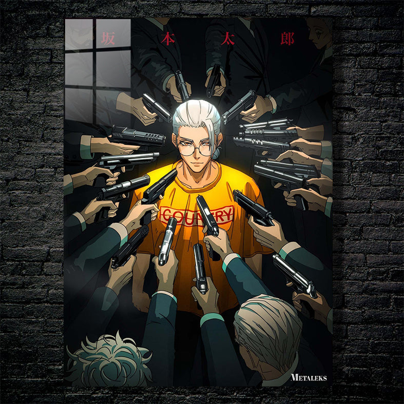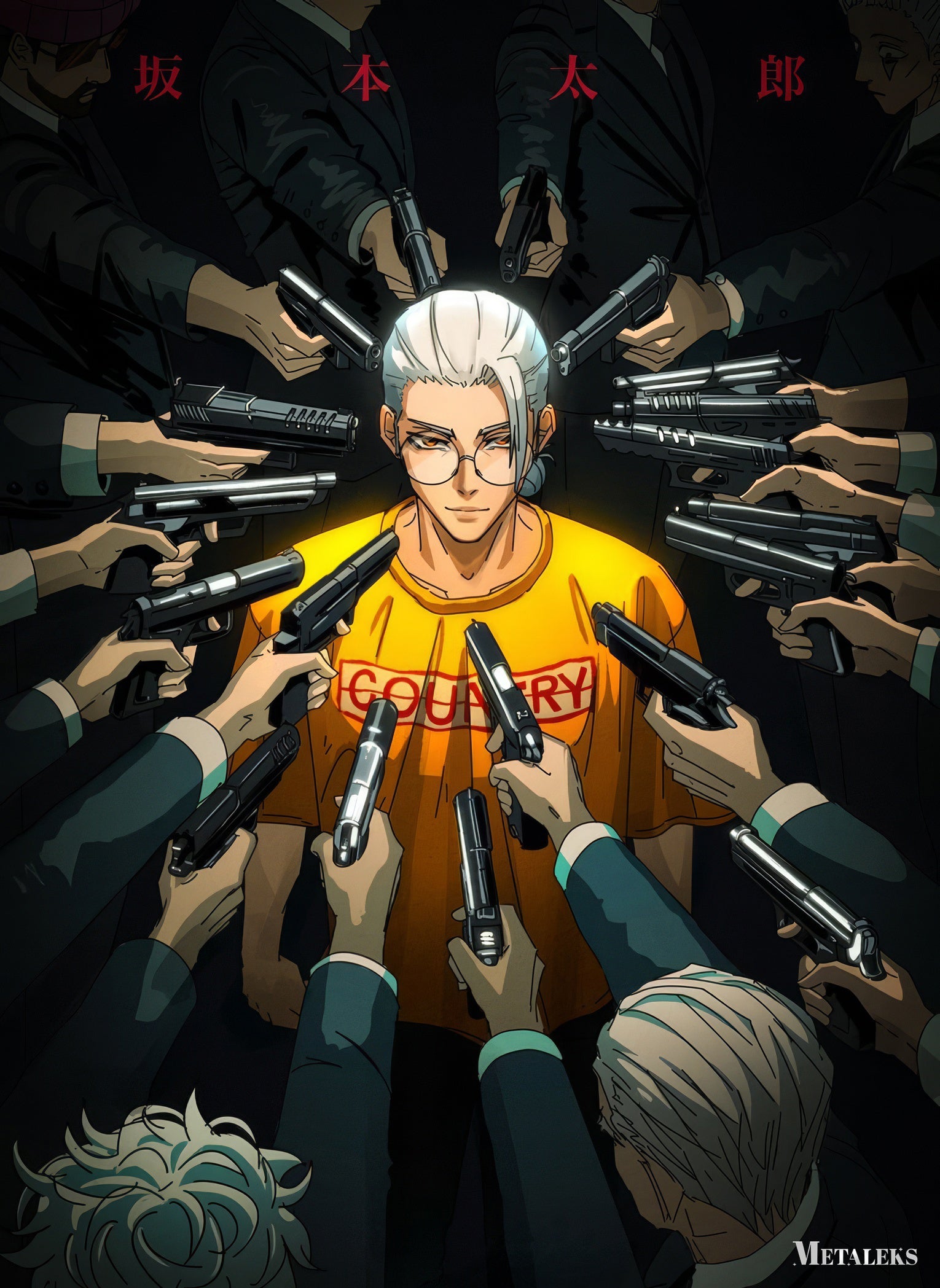 A character wearing a yellow shirt with “COUNTRY” printed on it is surrounded by multiple people pointing guns at him. Metaleks Ultra HD Metal Poster – Create Your Passionate Space.