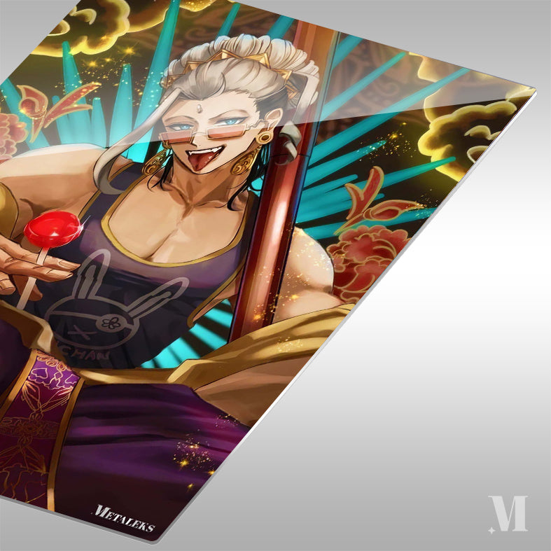 A character with a white topknot hairstyle, wearing a purple tank top with a bunny logo and gold trim, holds a red lollipop in one hand and a staff in the other. Metaleks Ultra HD Metal Poster – Create Your Passionate Space.