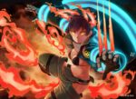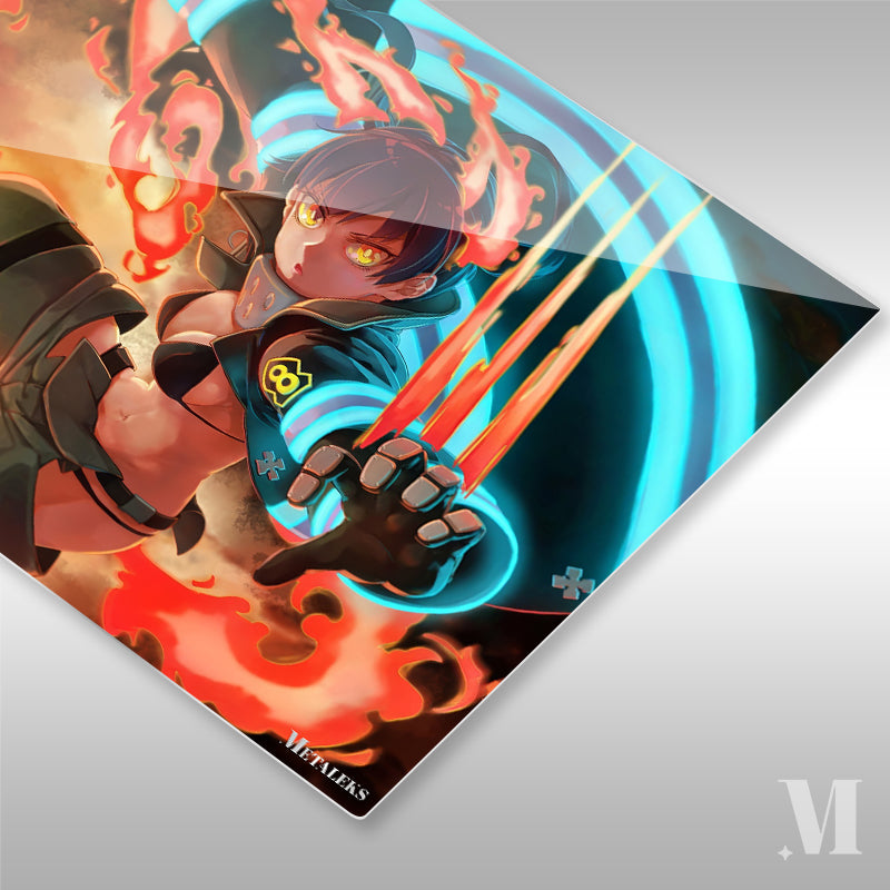 The image depicts a character in an action pose with flames surrounding them. The character has a determined expression, yellow eyes, and is wearing a black outfit with blue accents. The character’s right hand is extended forward with claw-like appendages, and there is a glowing blue and red energy effect around their arm. Metaleks Ultra HD Metal Poster – Create Your Passionate Space.