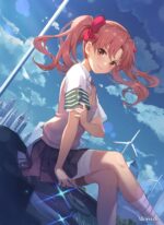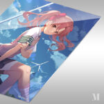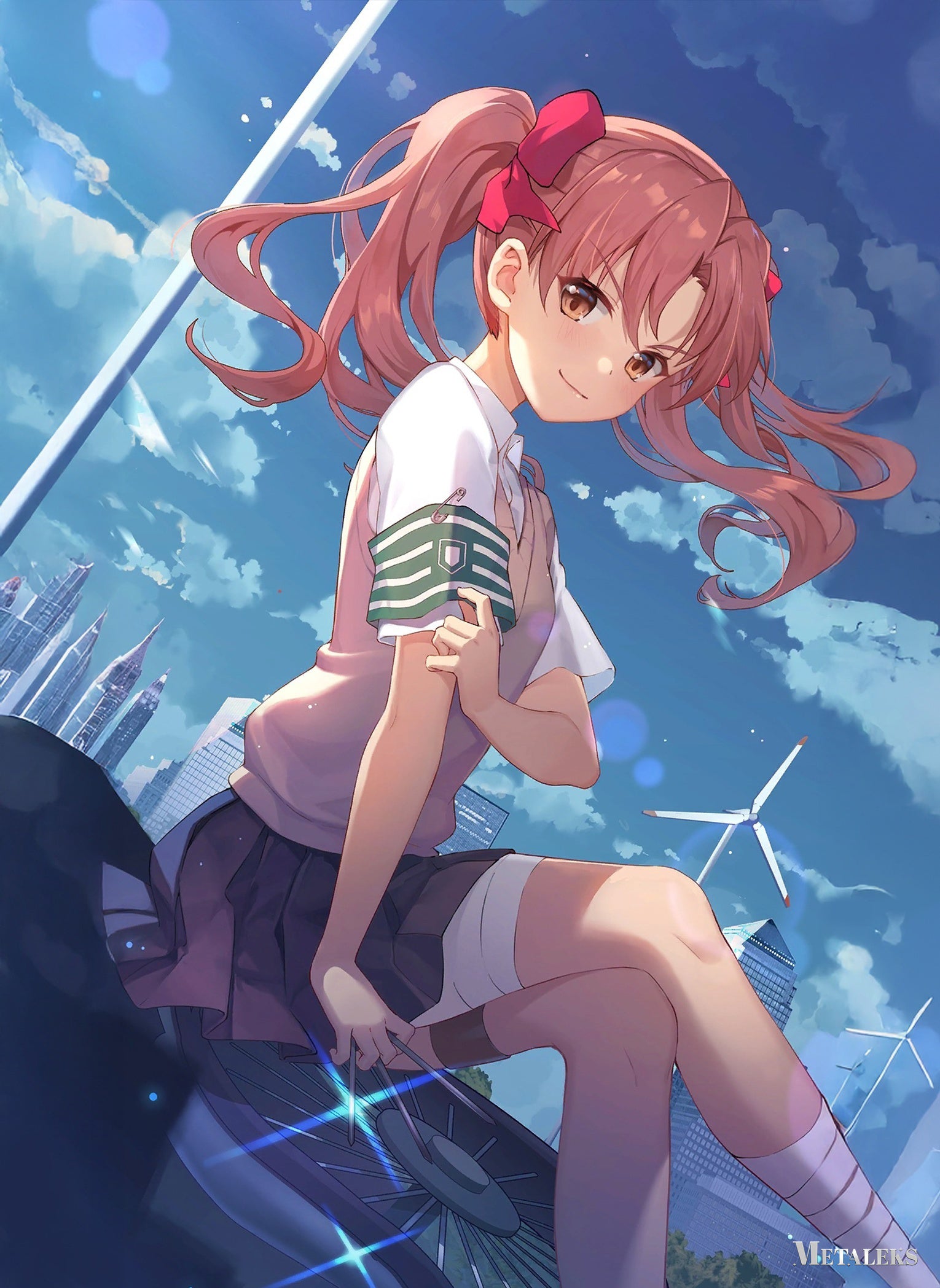 A girl with pink hair tied in a ponytail, wearing a white shirt, a pink vest, a dark skirt, and a green and white armband. She is sitting on a bicycle with a cityscape and wind turbines in the background. Metaleks Ultra HD Metal Poster – Create Your Passionate Space.