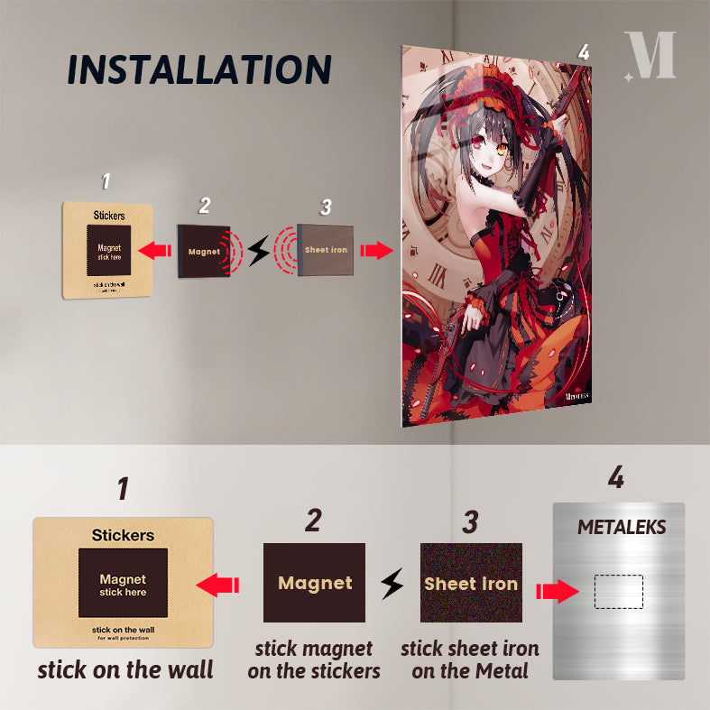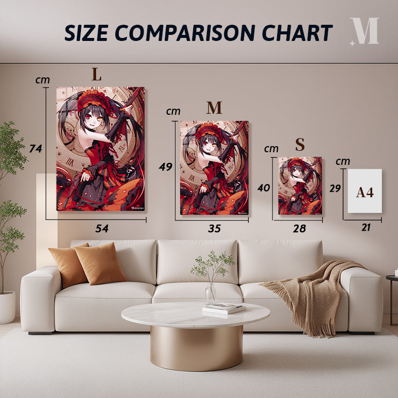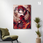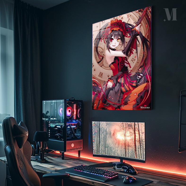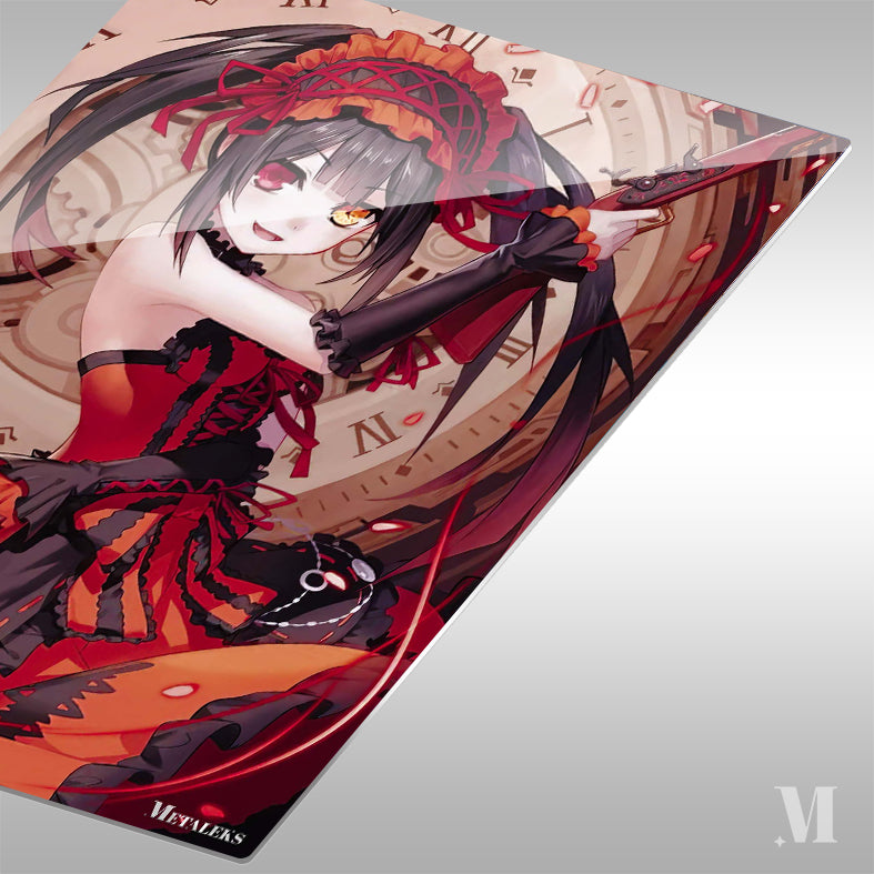 Tohka Yatogami from the anime “Date A Live” is holding a gun. She is wearing a red and black outfit with a matching headpiece. Her hair is long and dark, and she has one red eye and one yellow eye. Metaleks Ultra HD Metal Poster – Create Your Passionate Space.