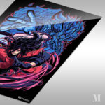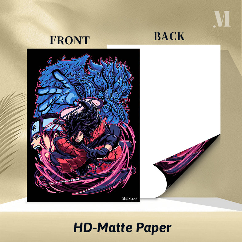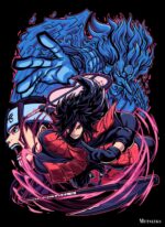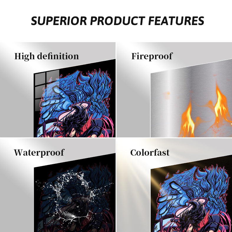This image features Sasuke Uchiha from the anime “Naruto.” He is depicted in a dynamic pose, wearing red armor and wielding a sword. His hair is black and spiky, and he has a determined expression on his face. Behind him, there is a large blue creature with a fierce appearance, adding to the intensity of the scene. The background is dark, which makes the characters and the creature stand out more prominently. Metaleks Ultra HD Metal Poster – Create Your Passionate Space.