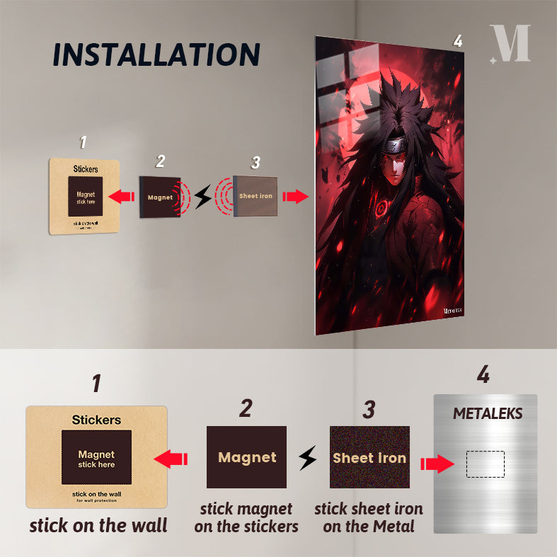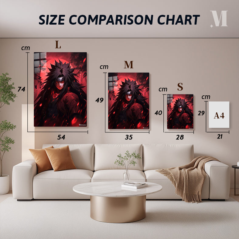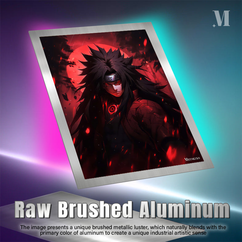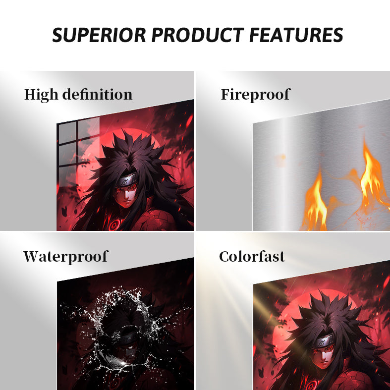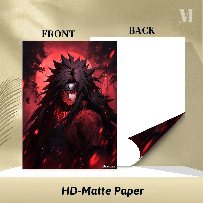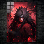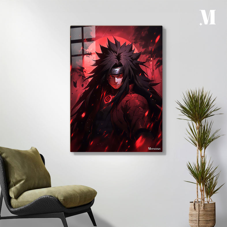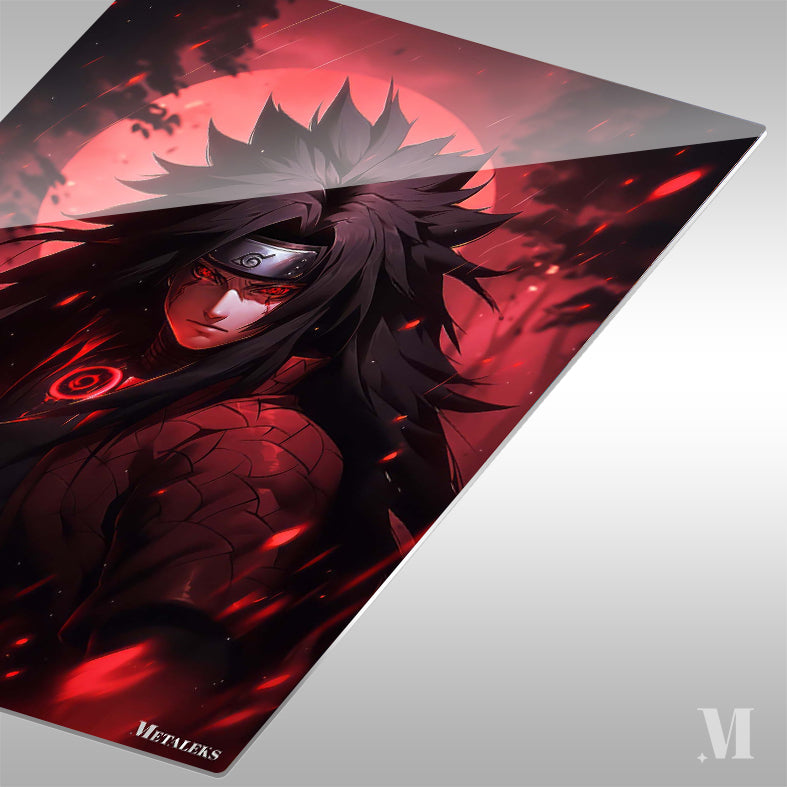 The subject is Madara Uchiha from the anime Naruto. He has long, spiky black hair, a headband with a symbol, and glowing red eyes. He wears a dark outfit with a red circular design on the chest and a textured pattern on the arm. Metaleks Ultra HD Metal Poster – Create Your Passionate Space.