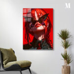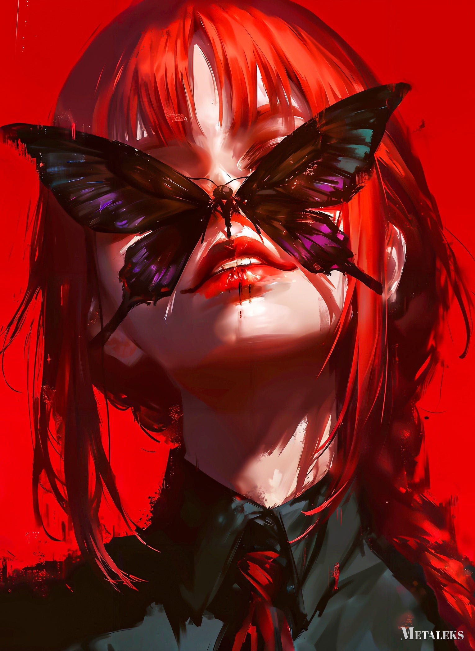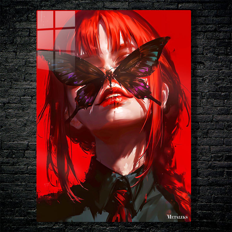 A person with long red hair, wearing a dark shirt and a red tie, has a large butterfly covering their eyes. Metaleks Ultra HD Metal Poster – Create Your Passionate Space.