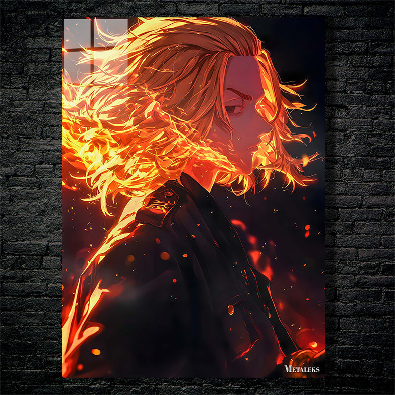 Kyojuro Rengoku from Demon Slayer has golden hair engulfed in flames. Metaleks Ultra HD Metal Poster – Create Your Passionate Space.