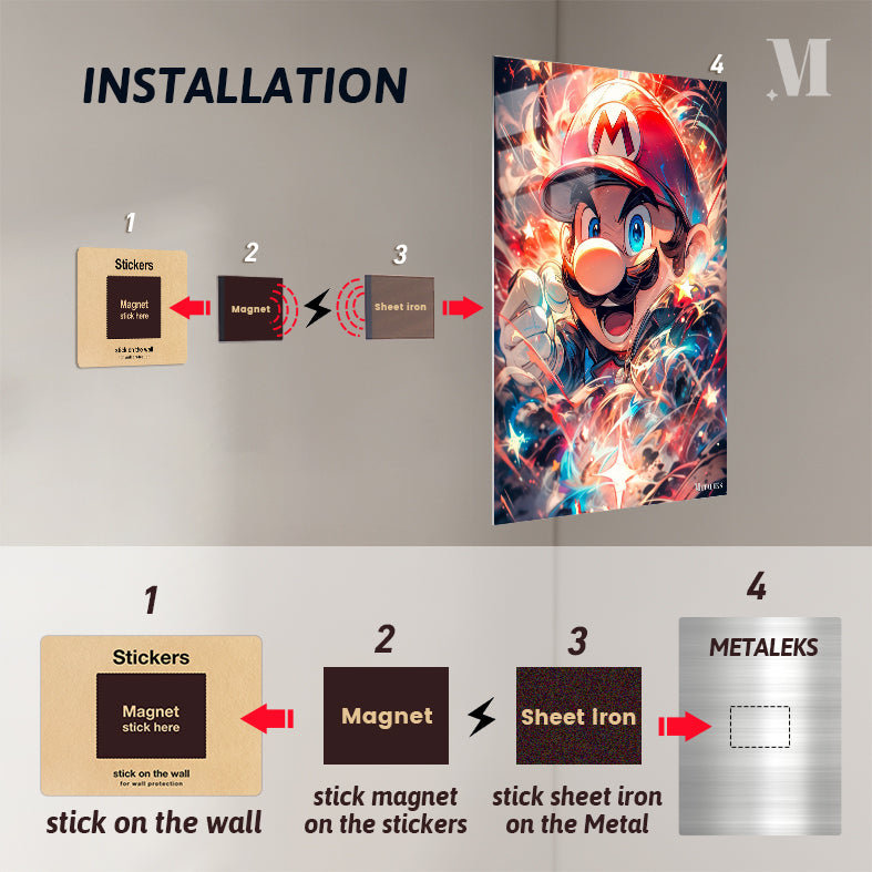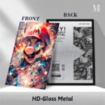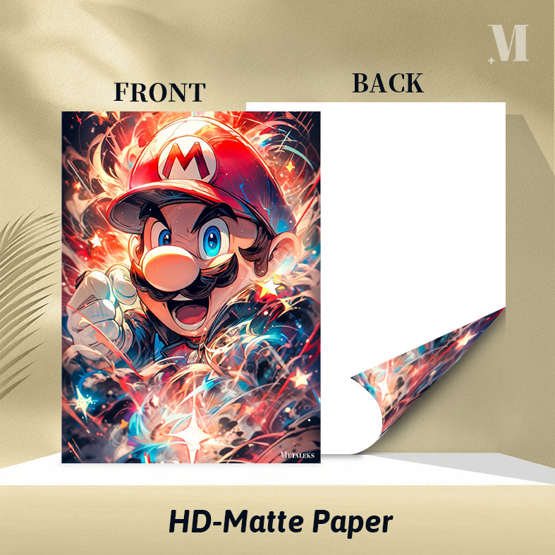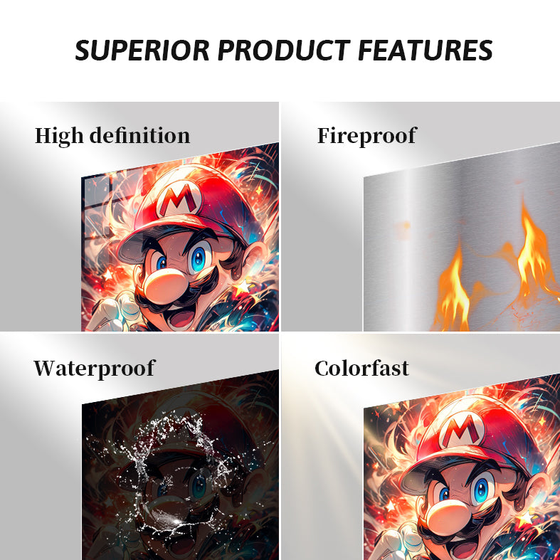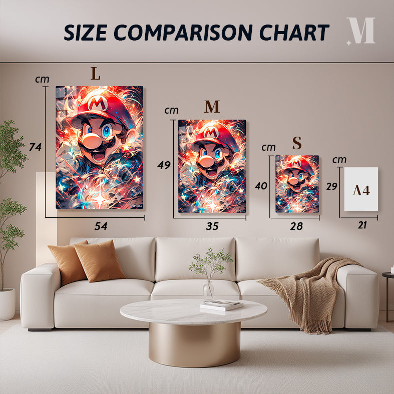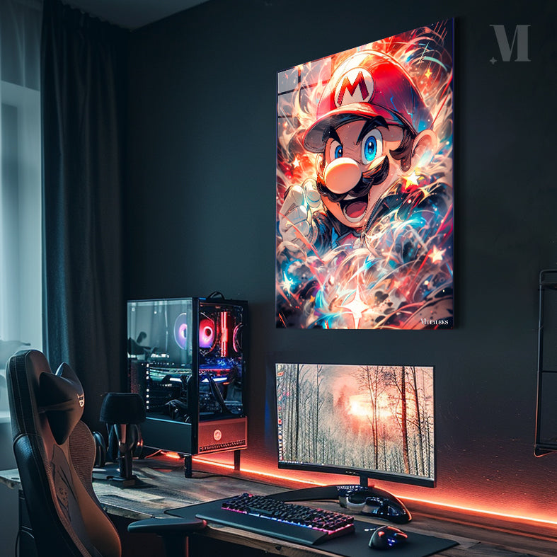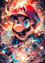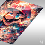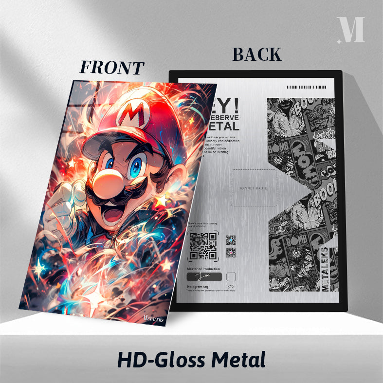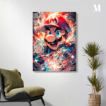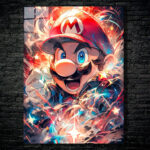 Mario, a character from the Super Mario series, is depicted wearing his iconic red hat with an “M” logo. He has a cheerful expression, with wide blue eyes and a big smile. His mustache is prominent, and he is shown in a dynamic pose, possibly celebrating or preparing for action. The background is filled with vibrant, colorful effects, adding to the energetic atmosphere. Metaleks Ultra HD Metal Poster – Create Your Passionate Space.