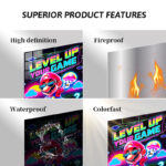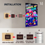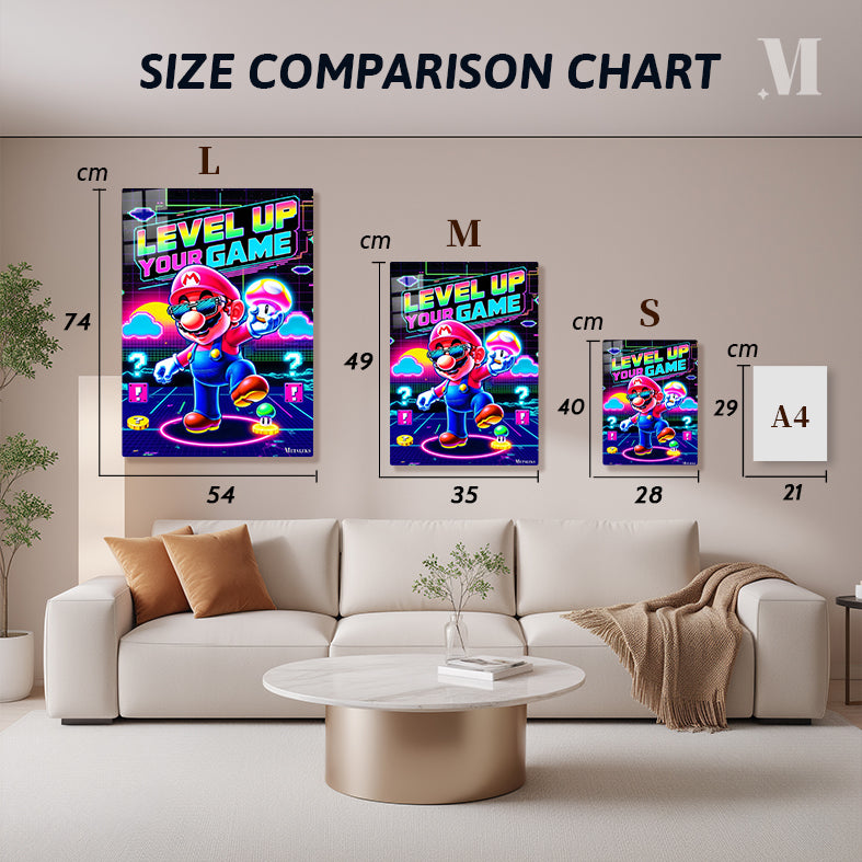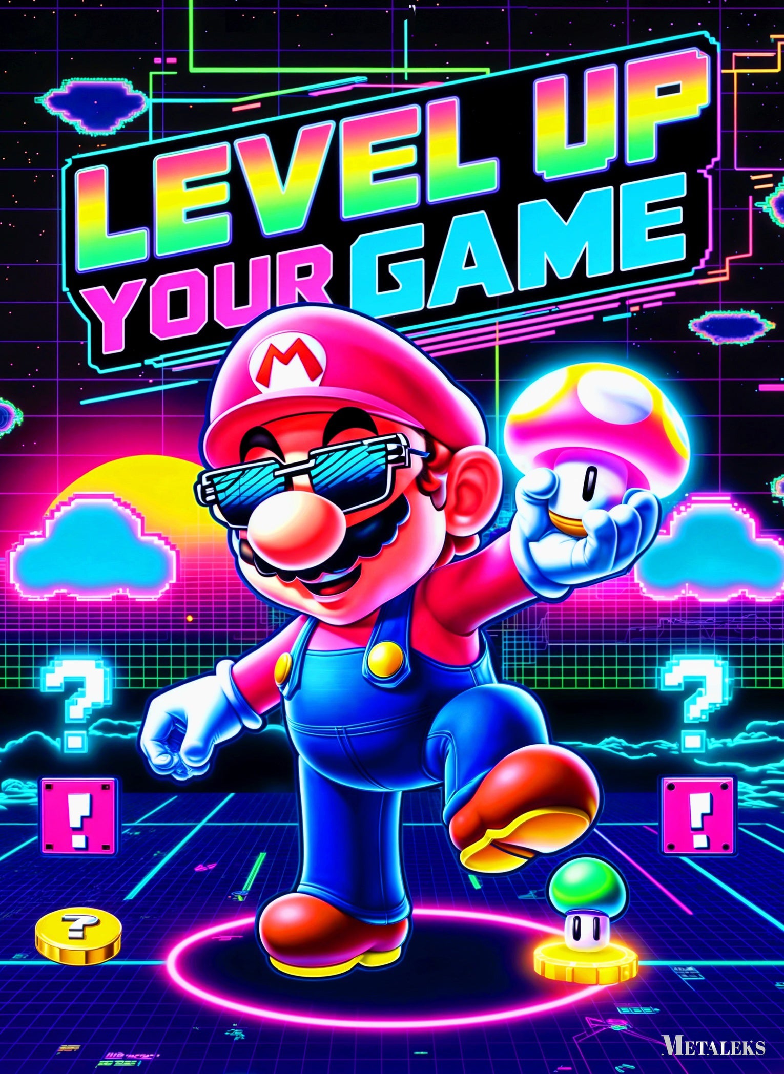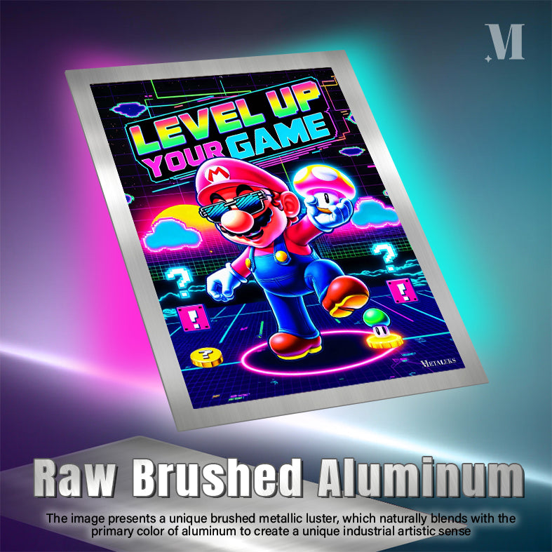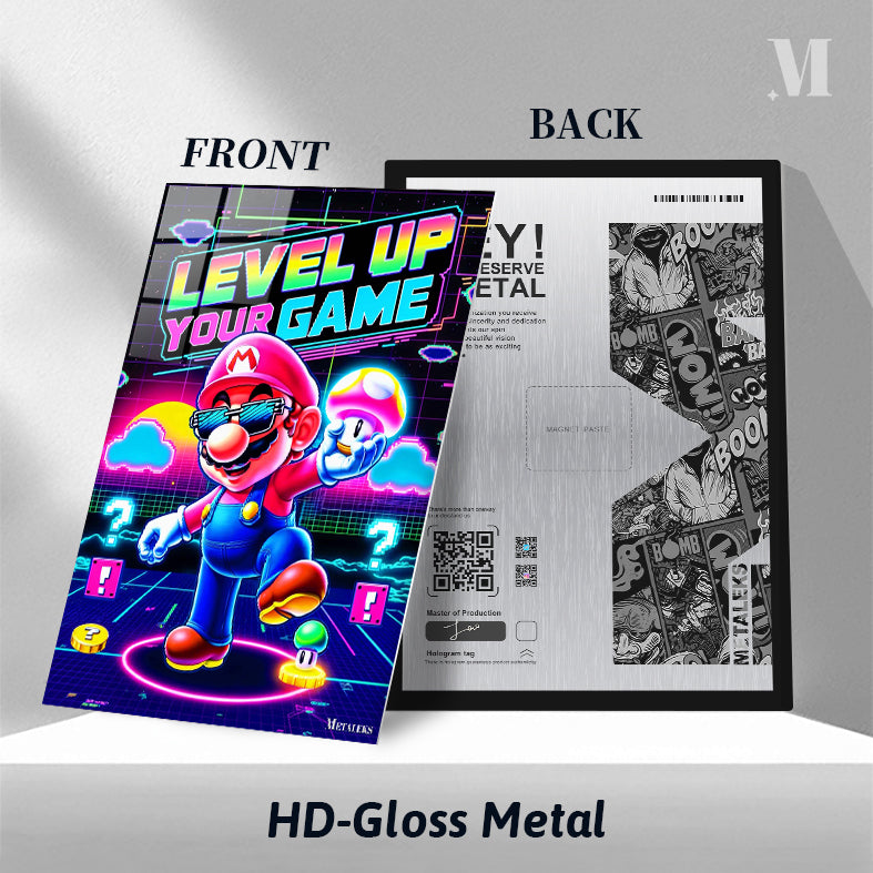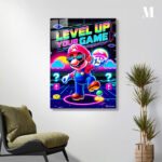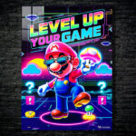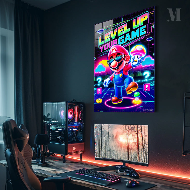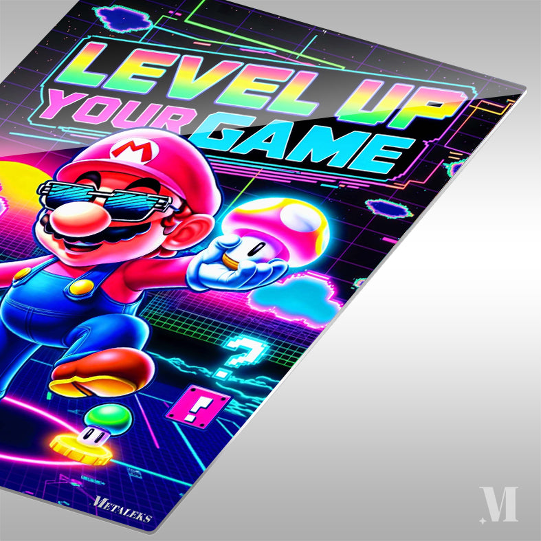 Mario from the Super Mario series is prominently featured, wearing sunglasses and holding a mushroom, with the text “LEVEL UP YOUR GAME” displayed above. Metaleks Ultra HD Metal Poster – Create Your Passionate Space.