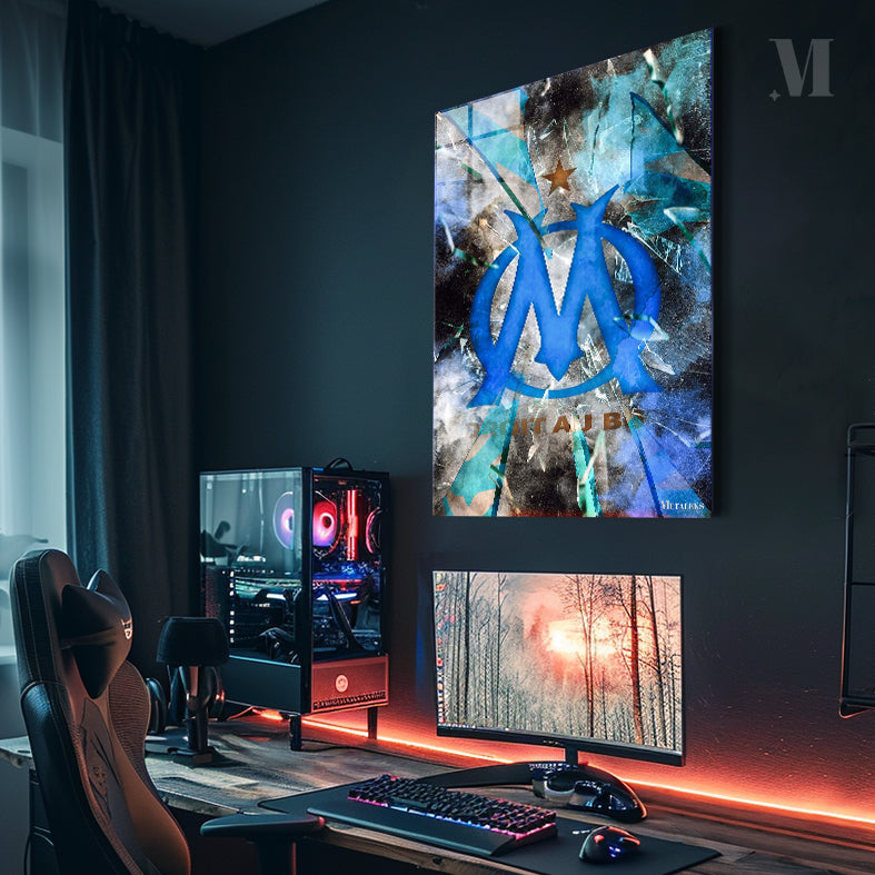 A blue circular emblem with a stylized “M” in the center. Above the emblem, there is a gold star. The background appears to be shattered glass with various shades of blue and green. Metaleks Ultra HD Metal Poster – Create Your Passionate Space.