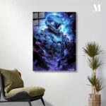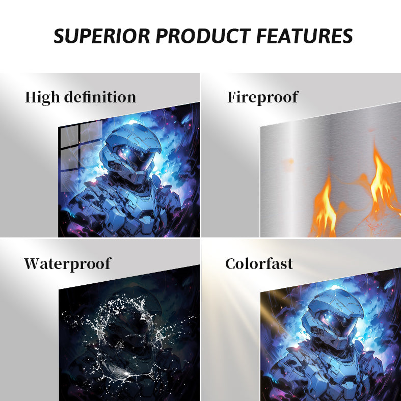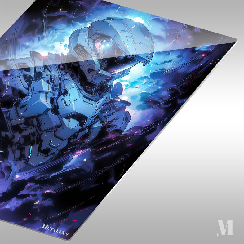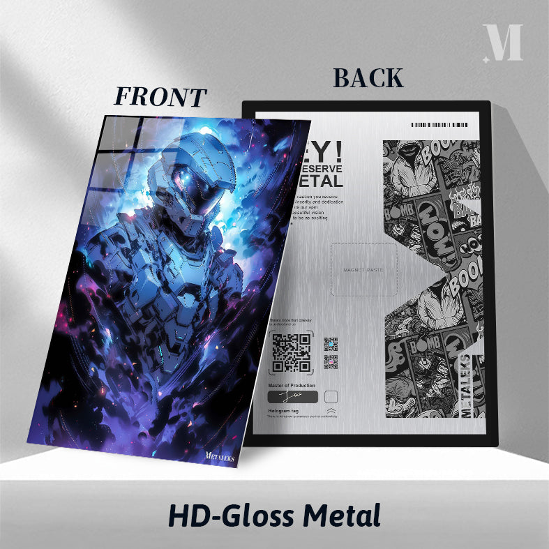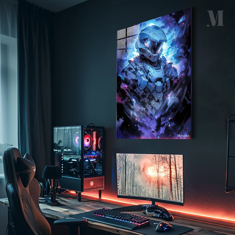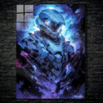The Master Chief, a character from the Halo video game series, is depicted in a futuristic suit of armor. The armor is primarily blue and gray, with intricate details and glowing elements. The Master Chief is surrounded by a dynamic, colorful background that enhances the sense of action and intensity. Metaleks Ultra HD Metal Poster – Create Your Passionate Space.