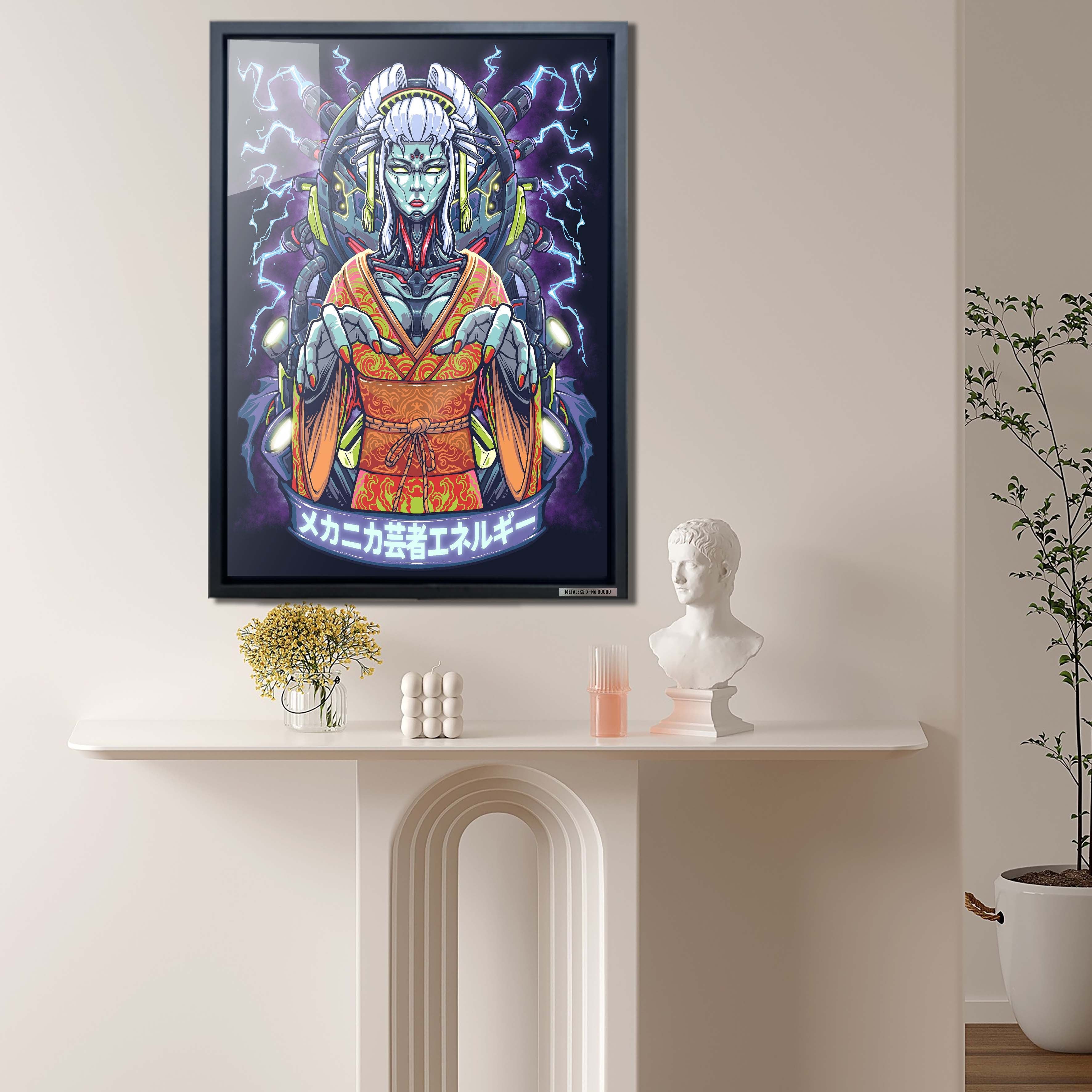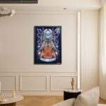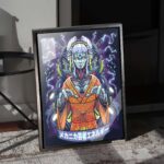 This painting, titled “CLOUD FINAL FANTASY” is inspired by the iconic character Cloud Strife from the classic video game series “Final Fantasy.” In the artwork, Cloud is depicted in his signature blue battle attire, wielding his massive sword, evoking a sense of imminent combat. The background features structures and smoke that create a mysterious and futuristic world. The Japanese characters “クラウド” at the top spell out Cloud’s name, further emphasizing the theme and atmosphere of the piece.
