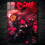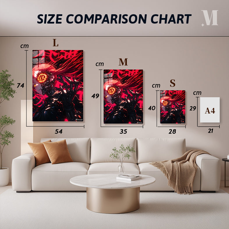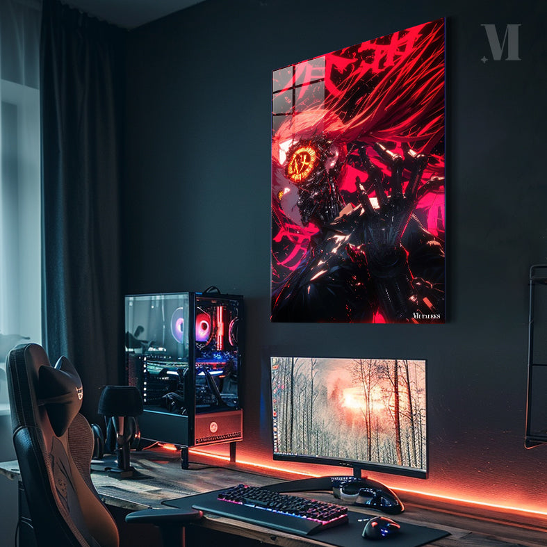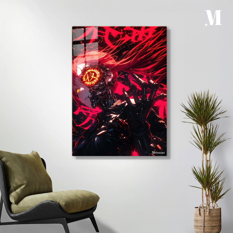 The image depicts a character with long red hair, wearing a black outfit with mechanical elements. The character’s face is partially obscured by a mechanical device with a glowing orange symbol that reads “权” (power). The character’s right hand is a mechanical claw, and there is a dramatic red and black color scheme throughout the image. Metaleks Ultra HD Metal Poster – Create Your Passionate Space.