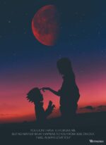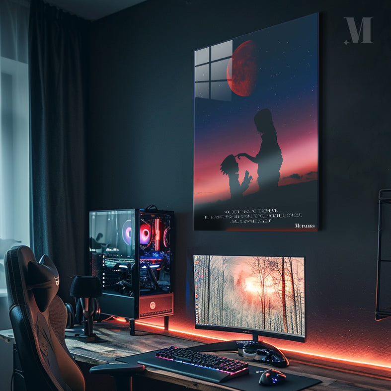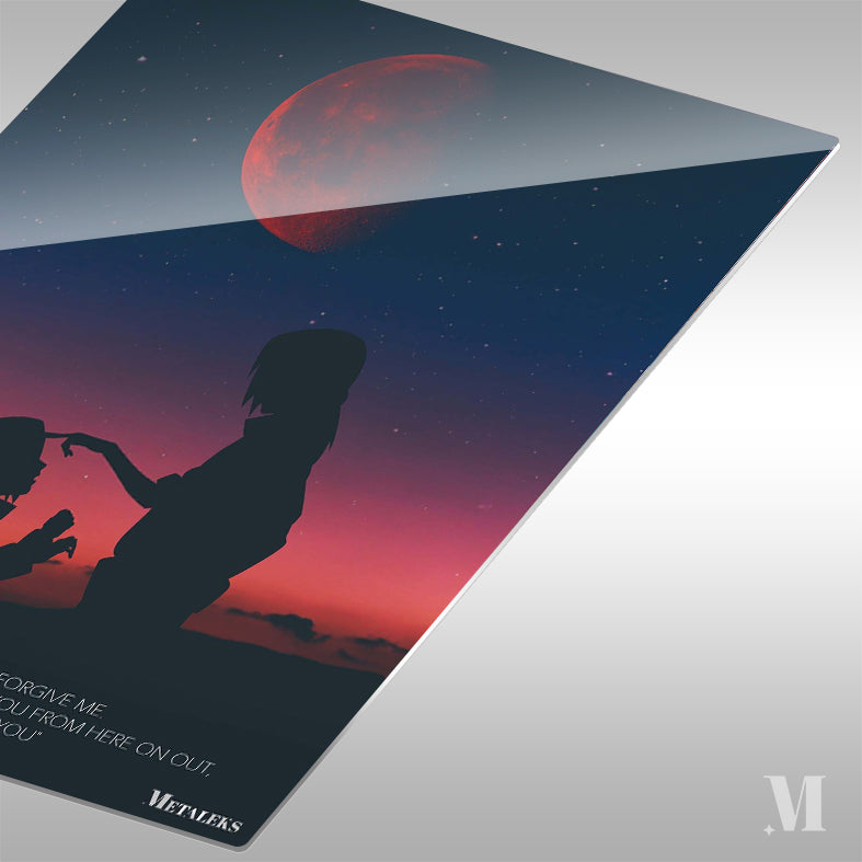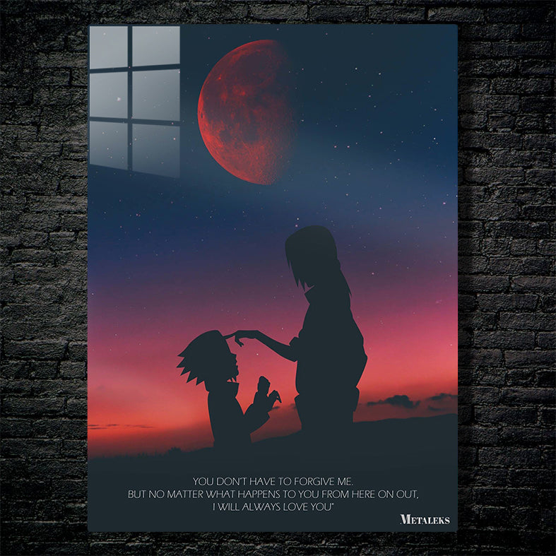 The silhouettes of Sasuke Uchiha and Itachi Uchiha from the anime Naruto stand against a backdrop of a starry sky and a large red moon. Itachi gently touches Sasuke’s forehead. Metaleks Ultra HD Metal Poster – Create Your Passionate Space.