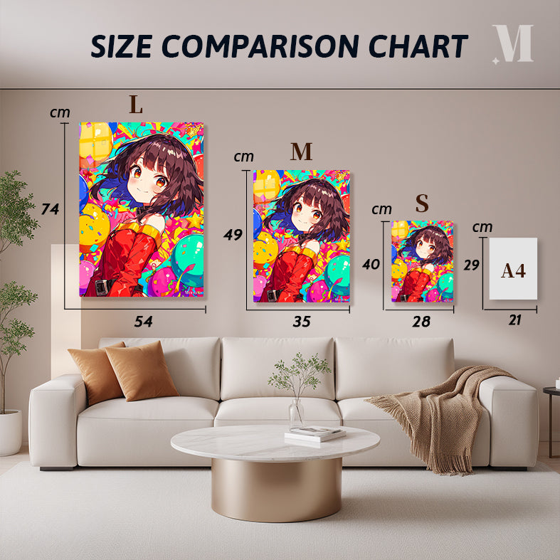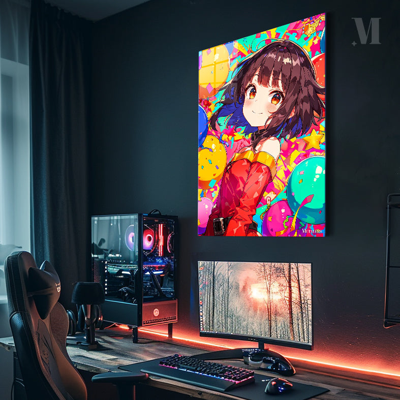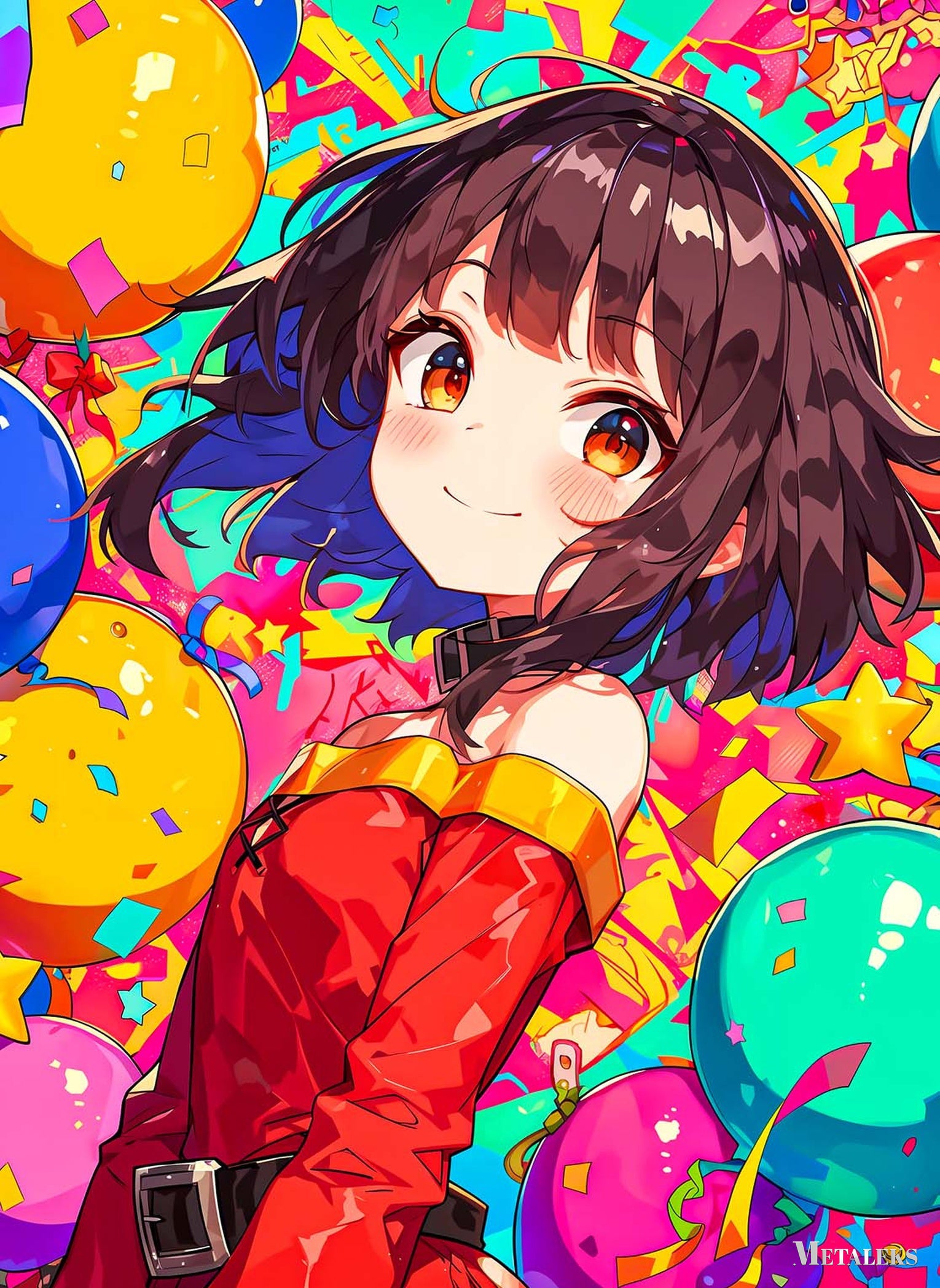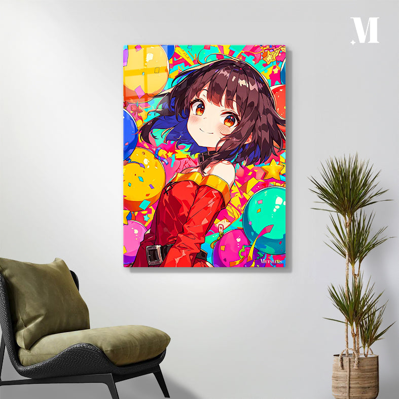 The image features an anime-style character with shoulder-length dark hair and orange eyes. She is wearing a red off-shoulder outfit with yellow trim and a black belt. The background is colorful with various balloons and confetti. Metaleks Ultra HD Metal Poster – Create Your Passionate Space.