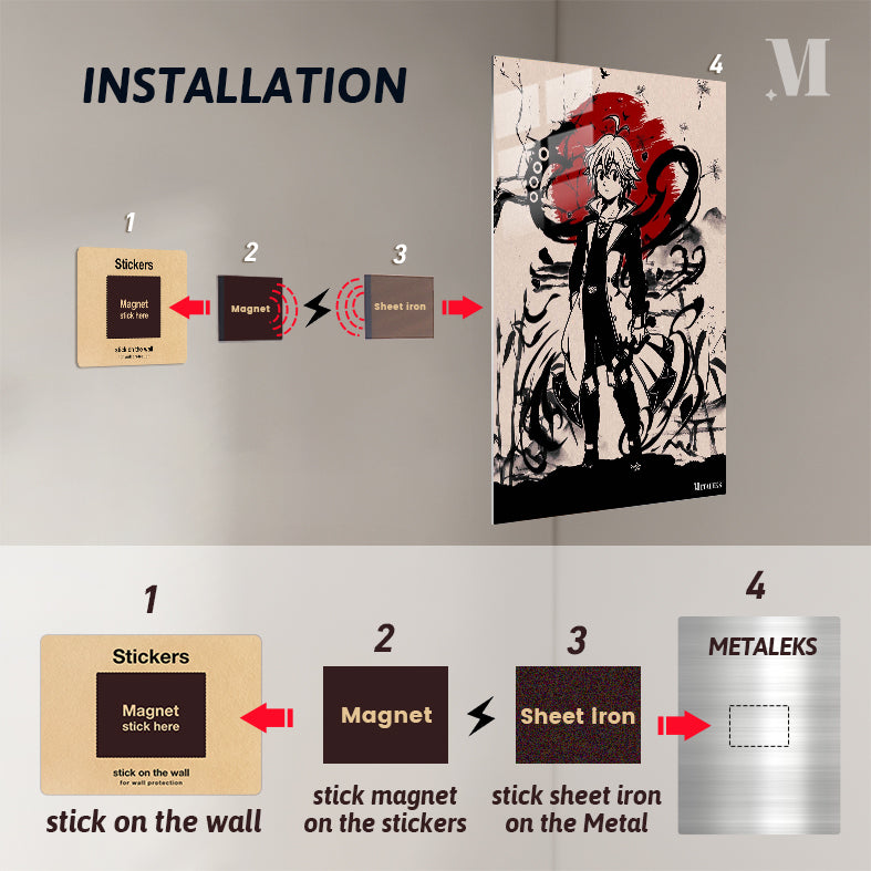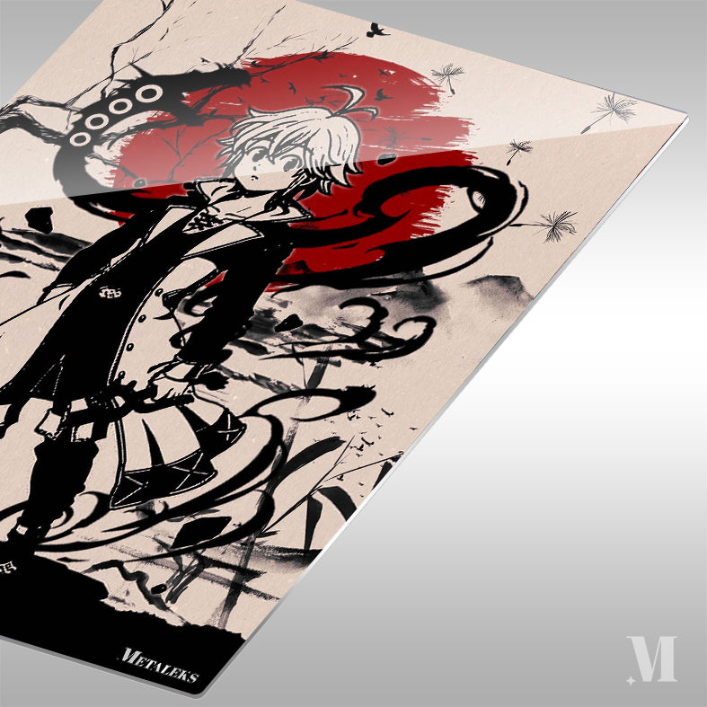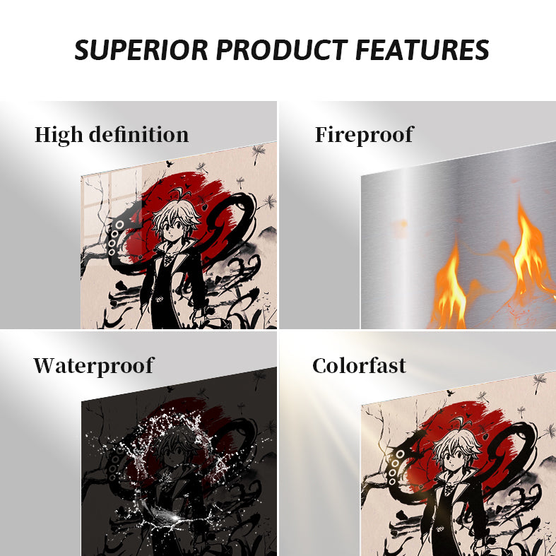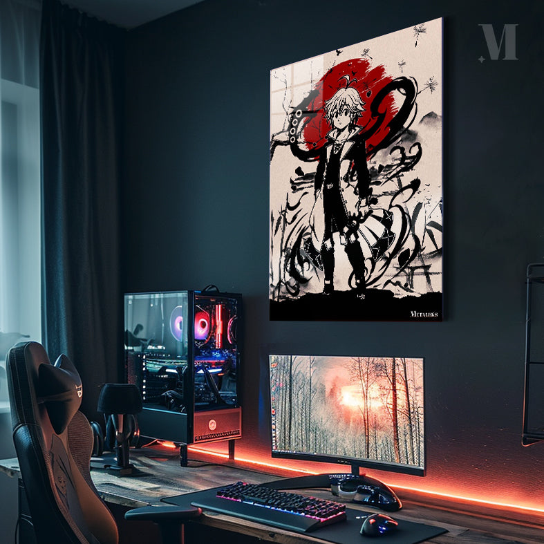 Meliodas from The Seven Deadly Sins is depicted in a dynamic pose, wearing a black and white outfit with a coat. He has light-colored hair and is surrounded by swirling black energy and a large red circle in the background. Metaleks Ultra HD Metal Poster – Create Your Passionate Space.