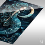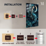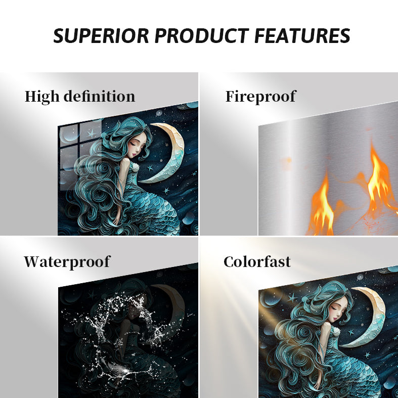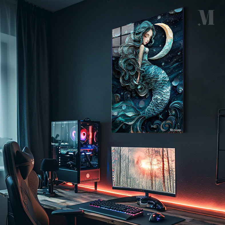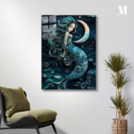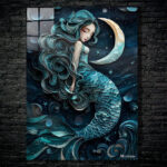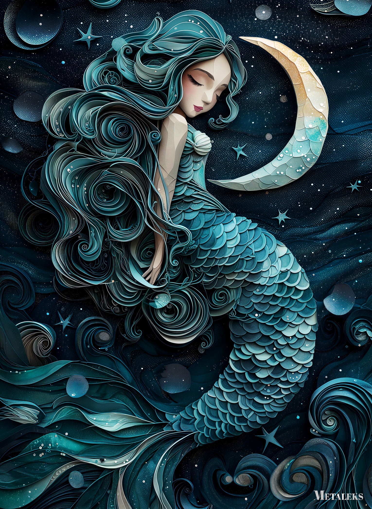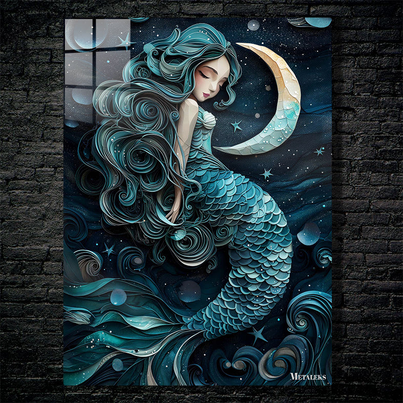 A mermaid with long, flowing blue-green hair and a scaly tail is resting near a crescent moon in a starry night sky. Metaleks Ultra HD Metal Poster – Create Your Passionate Space.