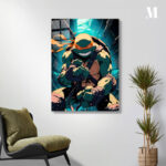 Leonardo, a character from the Teenage Mutant Ninja Turtles series, is depicted in a dynamic pose. He has a muscular build, green skin, and wears an orange mask. He is holding a sword on his back and has his fists clenched, suggesting readiness for action. Metaleks Ultra HD Metal Poster – Create Your Passionate Space.