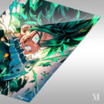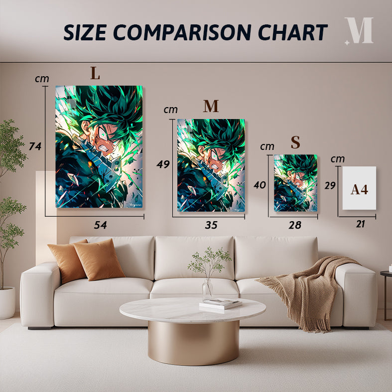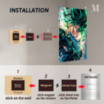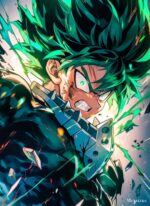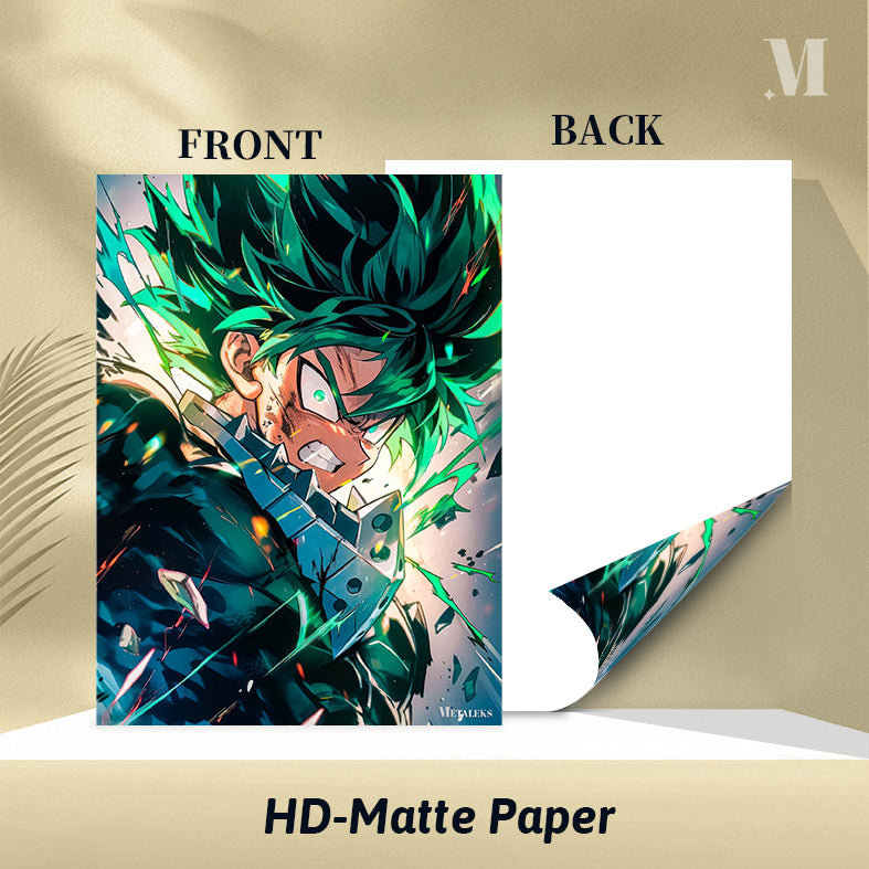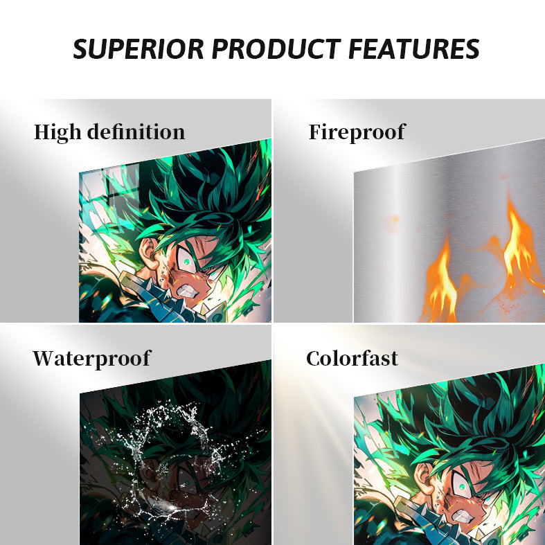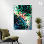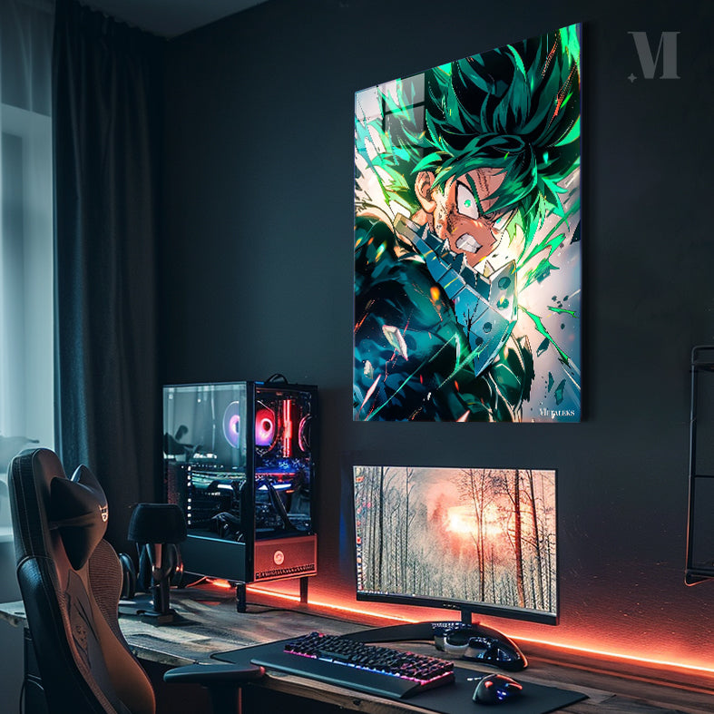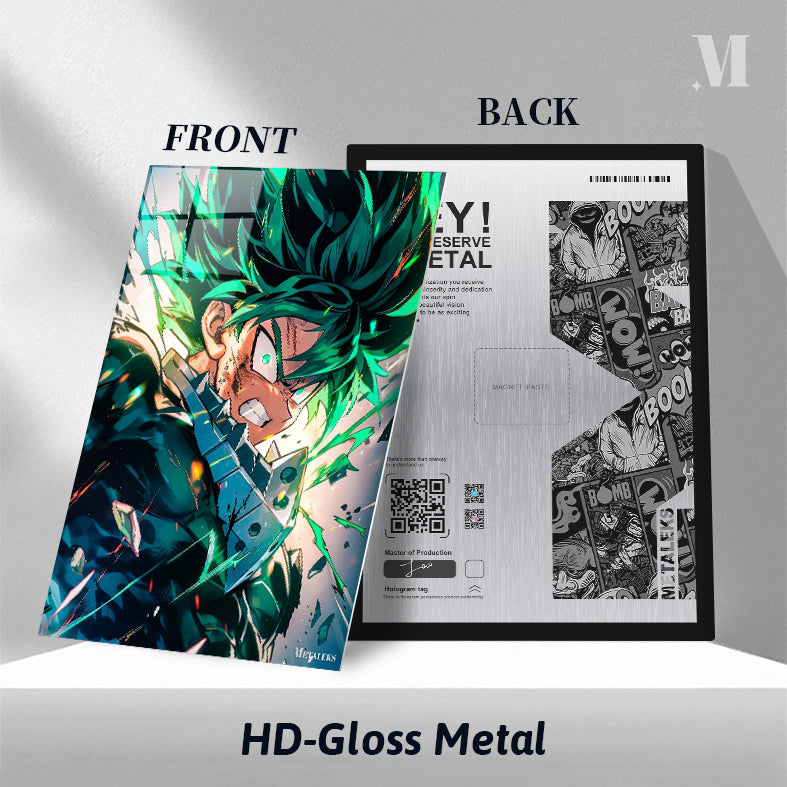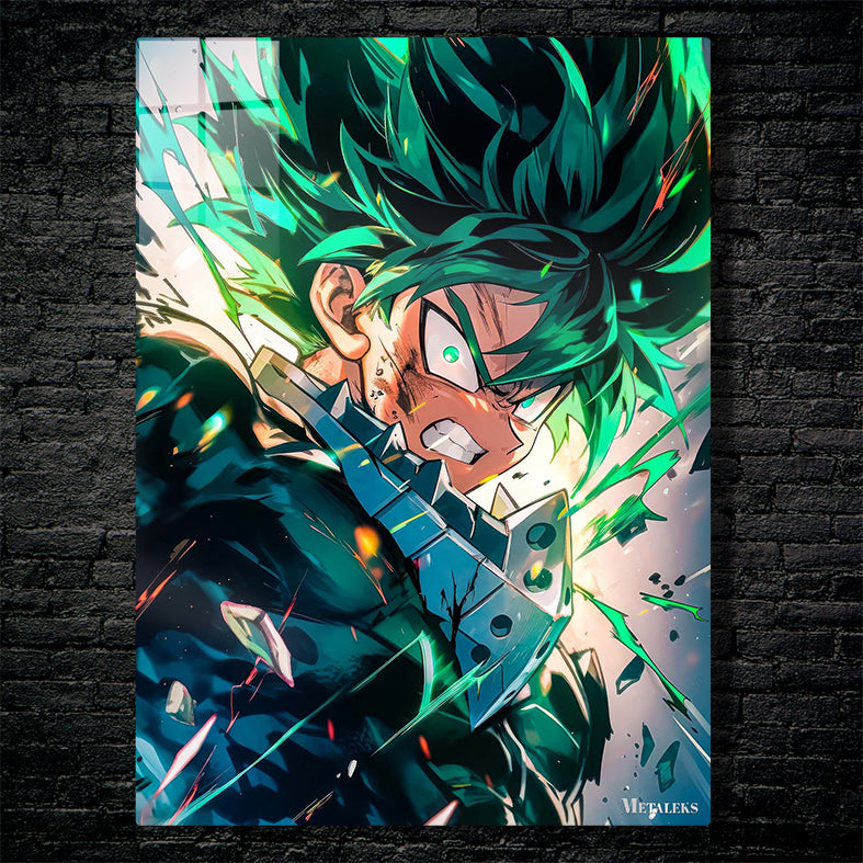 Izuku Midoriya from “My Hero Academia” is shown with spiky green hair, wearing a dark suit. His expression is intense, with a clenched jaw and glowing eyes, suggesting he is in a moment of action or combat. Metaleks Ultra HD Metal Poster – Create Your Passionate Space.