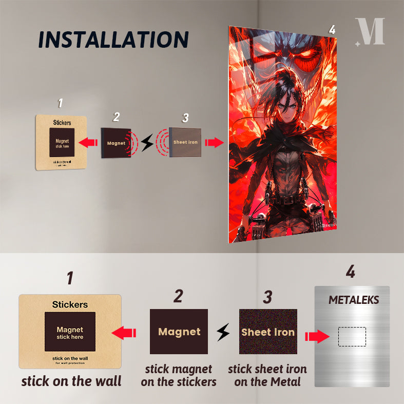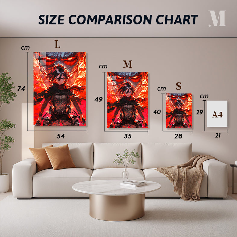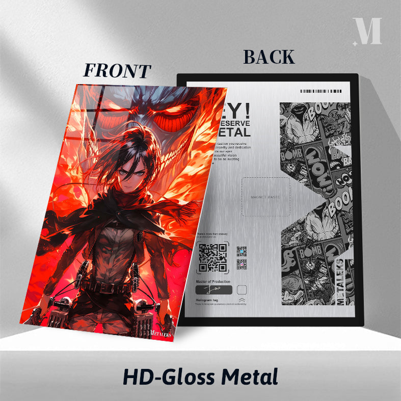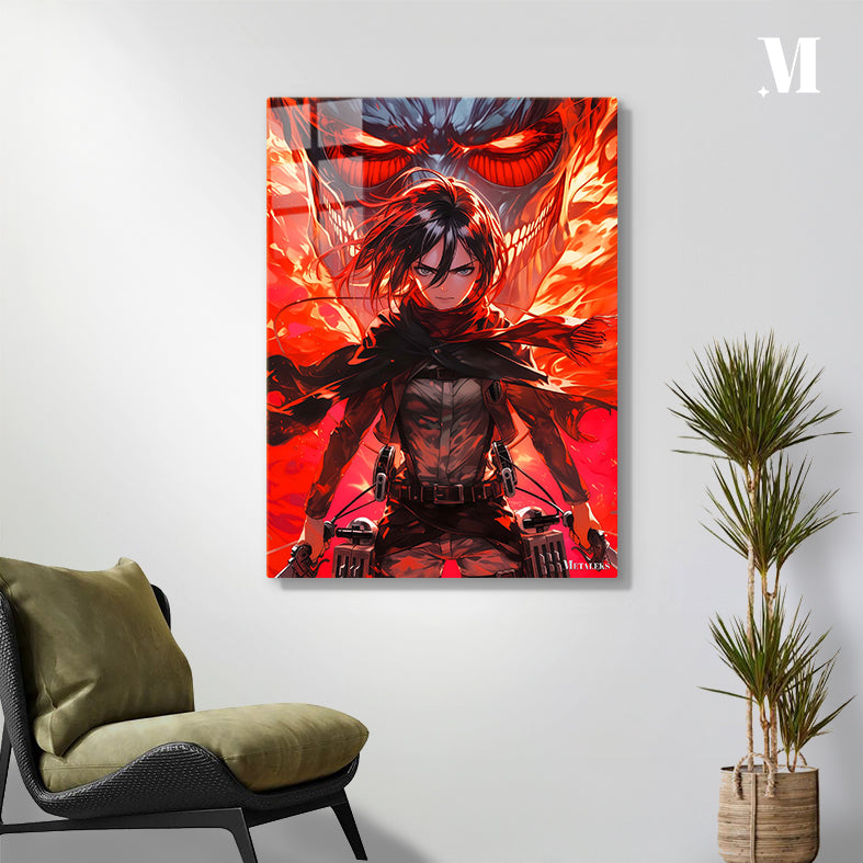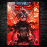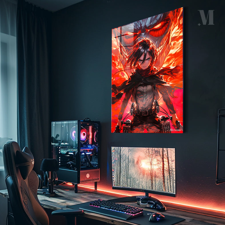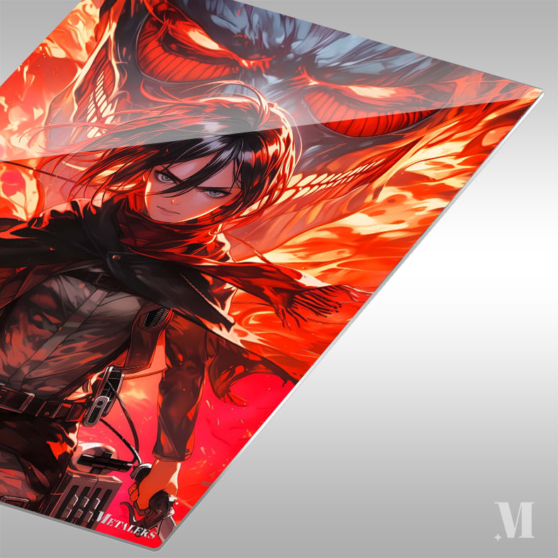 Mikasa Ackerman from Attack on Titan is depicted with her hair flowing, wearing a scarf and tactical gear, holding weapons. Behind her is a large, menacing Titan with glowing red eyes and flames. Metaleks Ultra HD Metal Poster – Create Your Passionate Space.