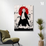 The character in the picture is Gojo Satoru from the anime “Jujutsu Kaisen.” He is depicted with long, white hair and wearing a black robe. Metaleks Ultra HD Metal Poster – Create Your Passionate Space.