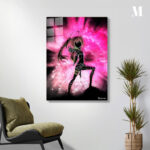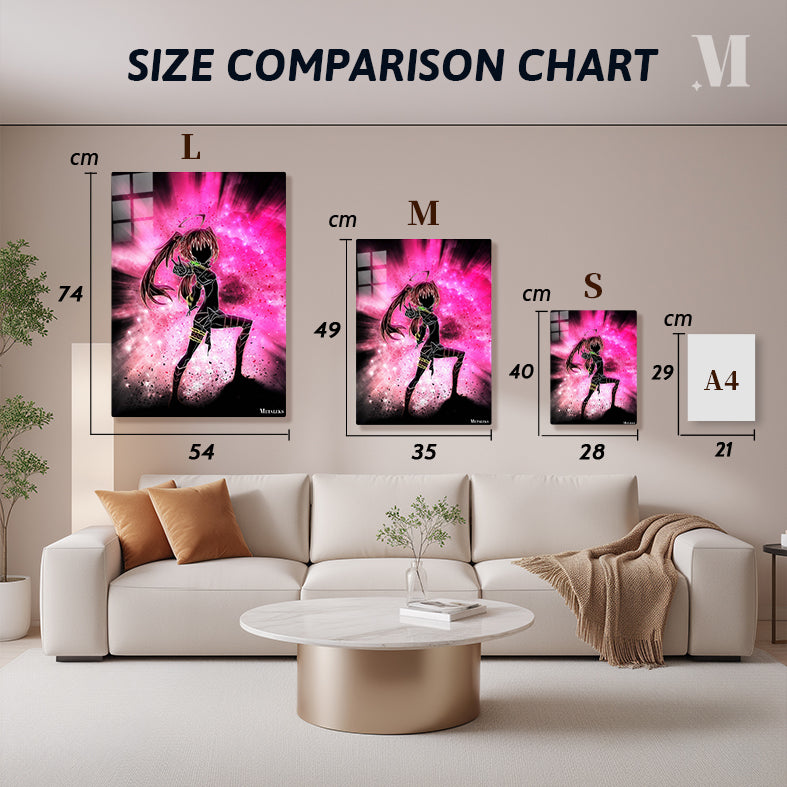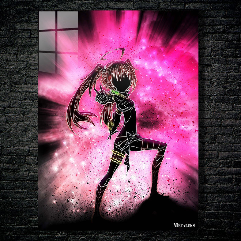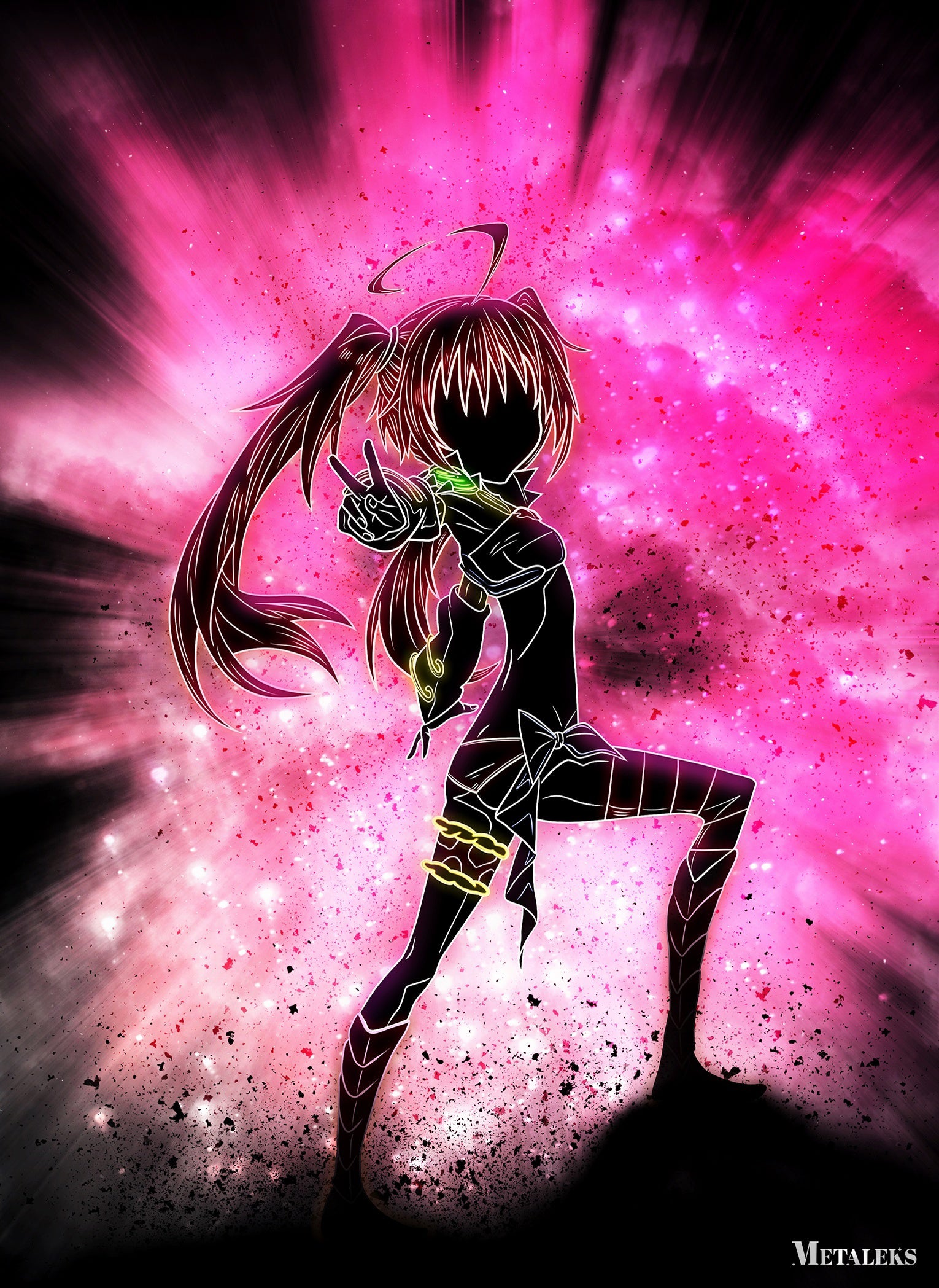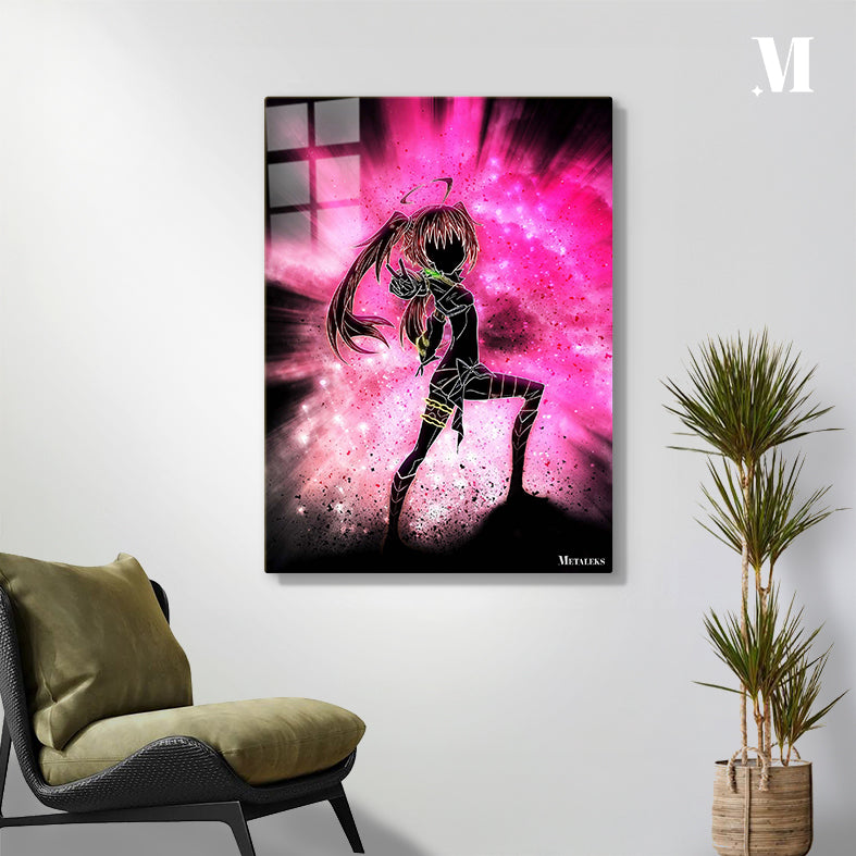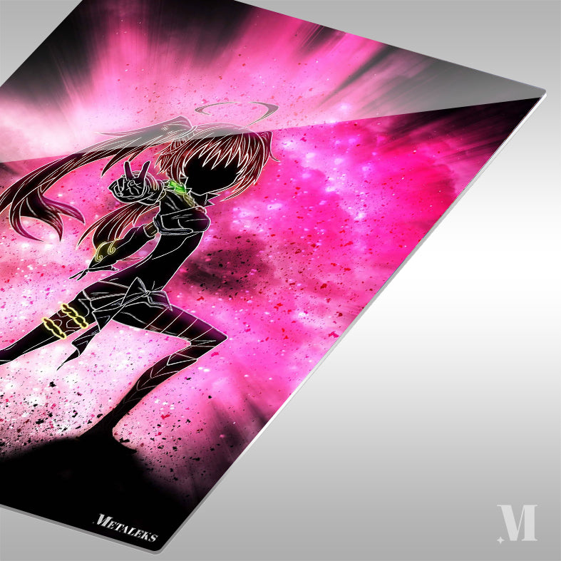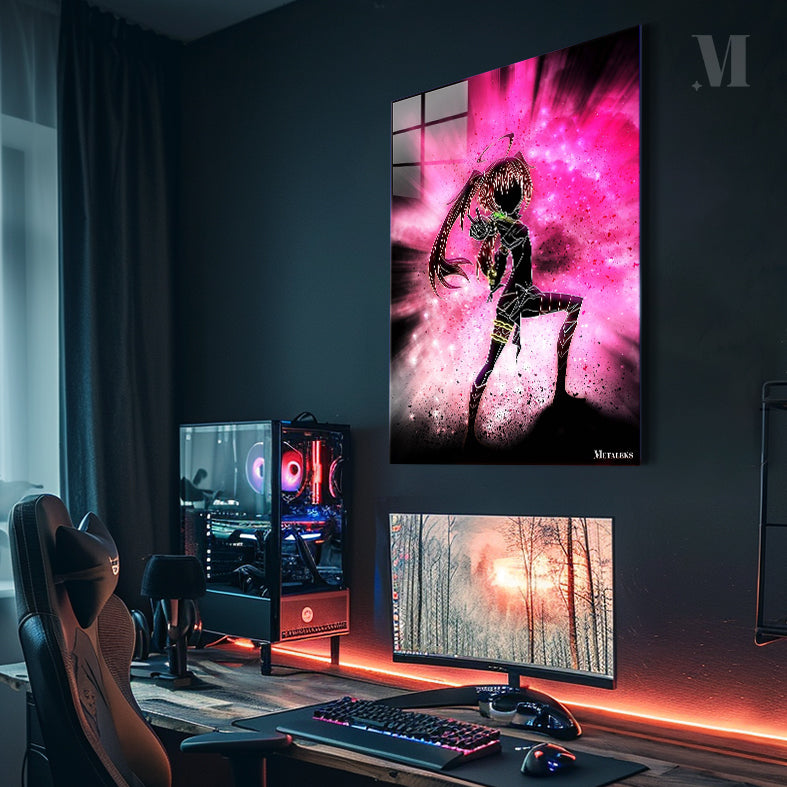 The image depicts an anime character with long hair in a ponytail, wearing a black outfit with glowing accents. The character is striking a dynamic pose, pointing forward with one hand. The background is a vibrant pink and purple explosion of light and particles, adding to the energetic feel of the image. Metaleks Ultra HD Metal Poster – Create Your Passionate Space.