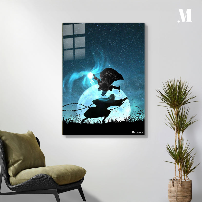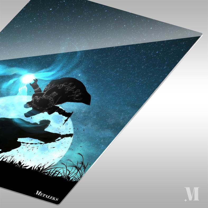 The image depicts a dynamic scene featuring two silhouetted figures against a starry night sky with a large moon. One figure, wearing a cape, is leaping into the air, extending their arm to emit a glowing blue energy blast. The other figure, also in a cape, is on the ground, holding a chain that appears to be connected to the leaping figure. The scene conveys a sense of action and conflict. Metaleks Ultra HD Metal Poster – Create Your Passionate Space.