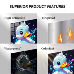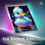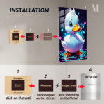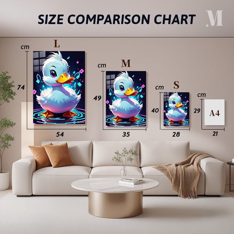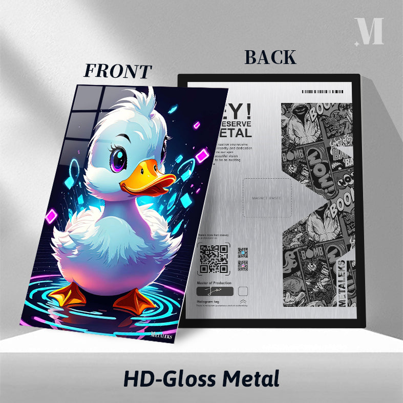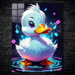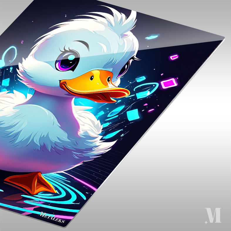 A cute, cartoon-style duck with white feathers, a yellow beak, and large purple eyes, surrounded by colorful glowing shapes and ripples. Metaleks Ultra HD Metal Poster – Create Your Passionate Space.