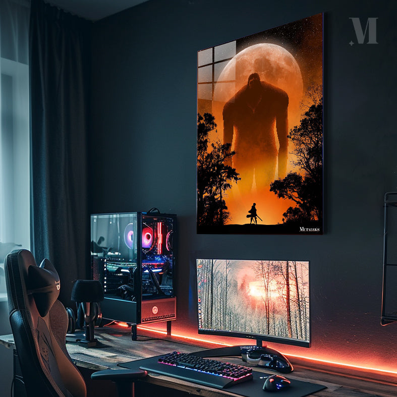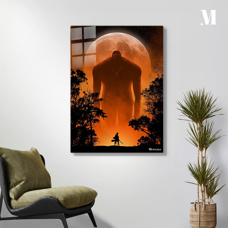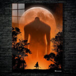 A colossal humanoid creature stands against a large, glowing moon. A smaller figure, holding a weapon, faces the creature. The scene is set against a backdrop of trees and an orange-hued sky. Metaleks Ultra HD Metal Poster – Create Your Passionate Space.