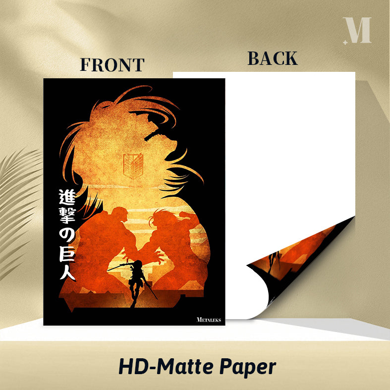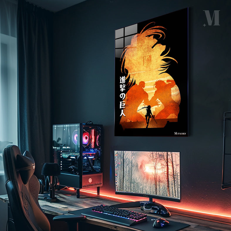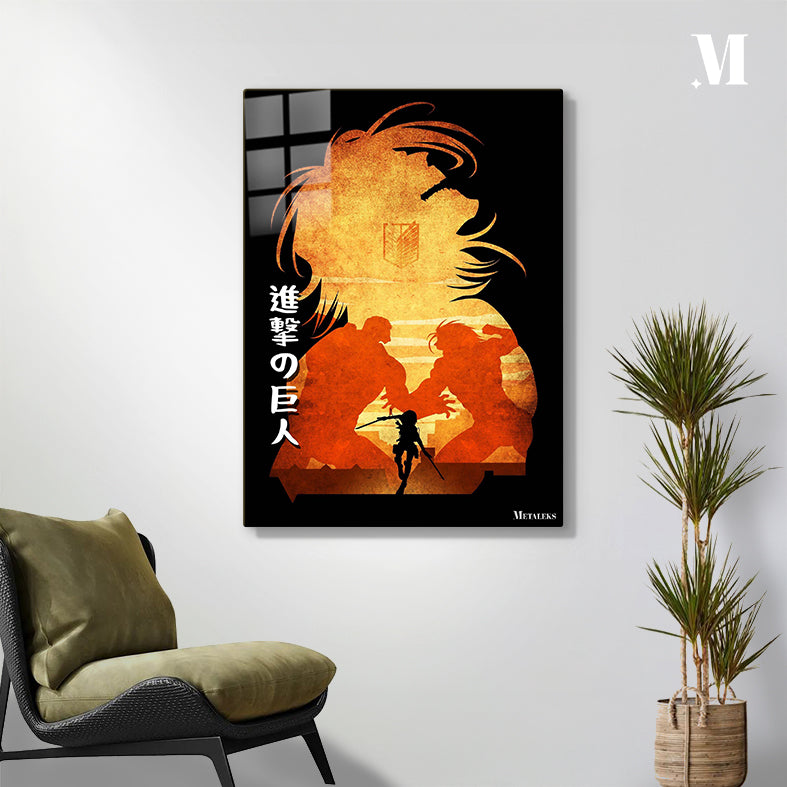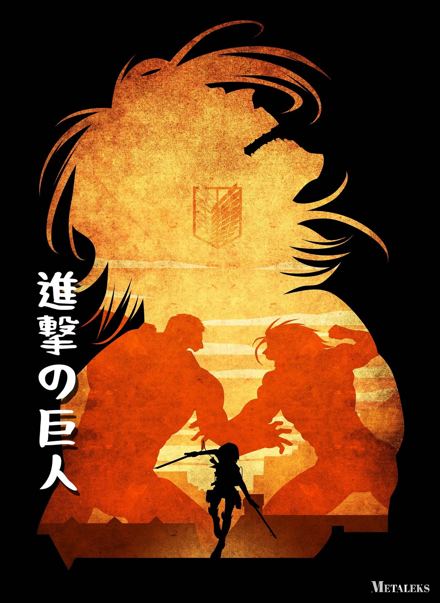 A silhouette of a character with long hair and a crest on their chest is depicted. Below them, two large figures are facing each other, and a smaller figure with weapons stands in front of them. The text “進撃の巨人” is visible on the left side. Metaleks Ultra HD Metal Poster – Create Your Passionate Space.