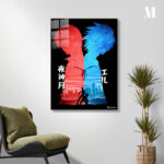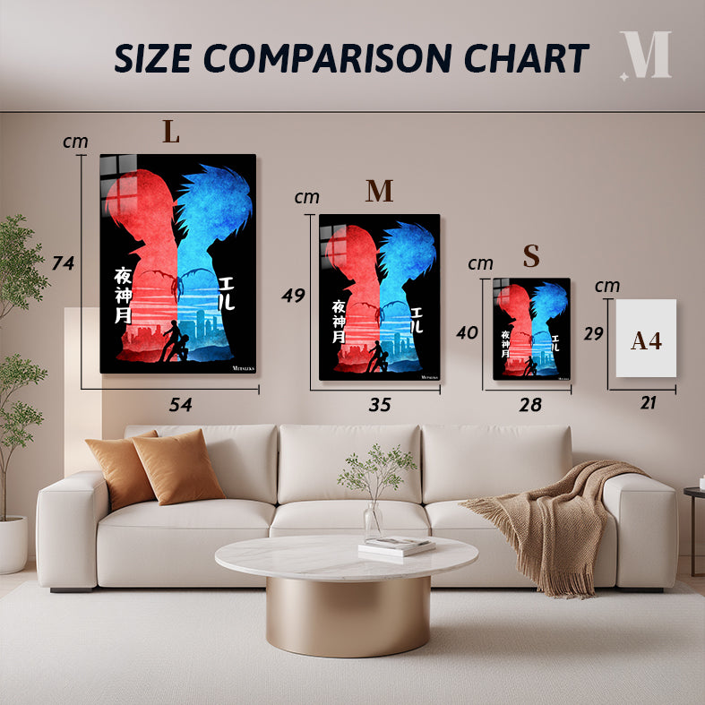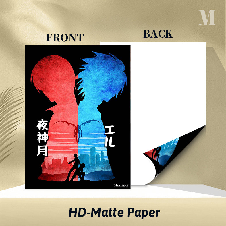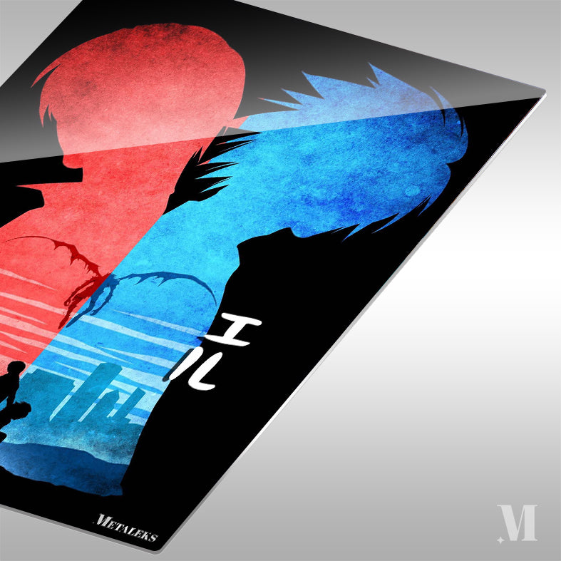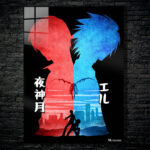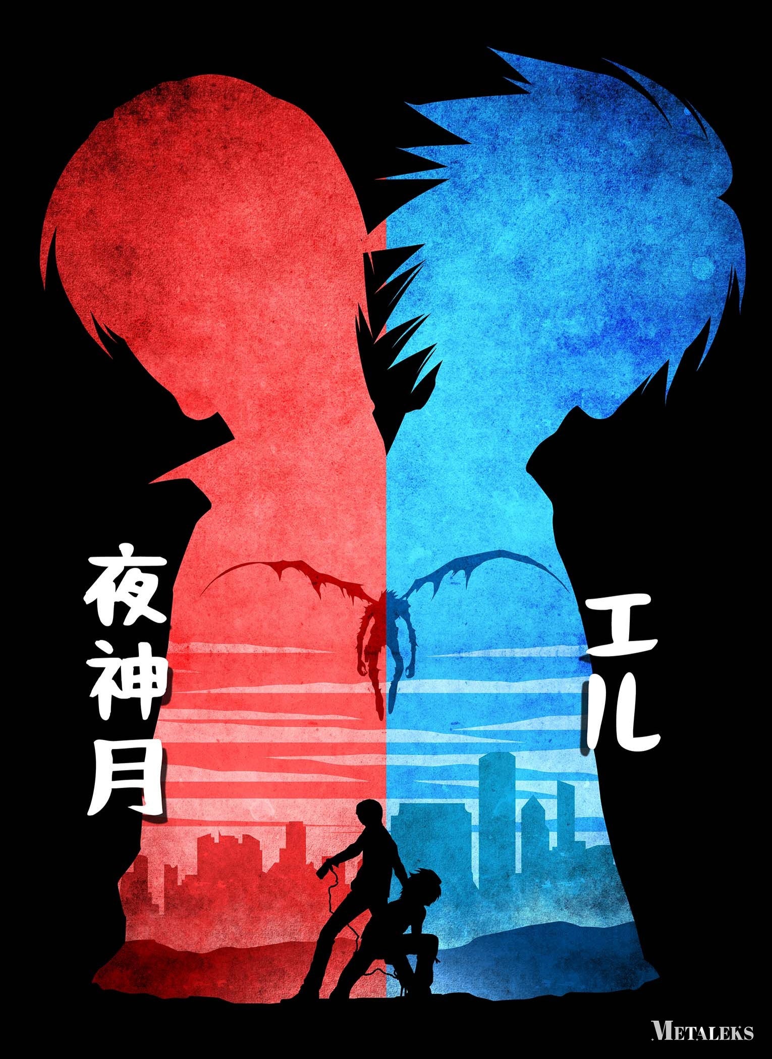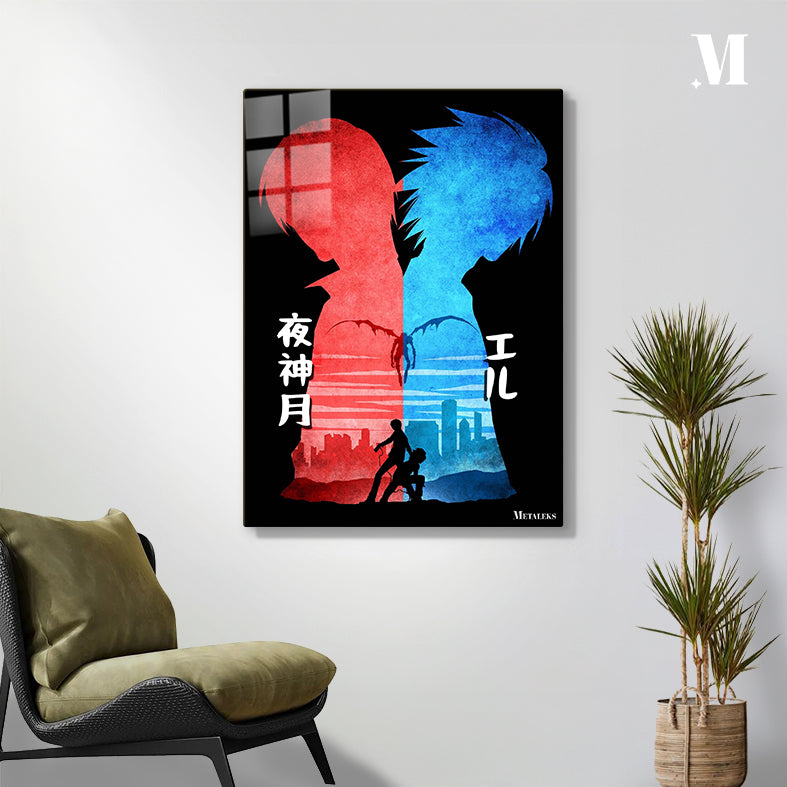 The image features silhouettes of two characters, one red and one blue. The red silhouette is labeled “夜神月” (Light Yagami) from “Death Note,” and the blue silhouette is labeled “L” (L Lawliet) from “Death Note.” Below them, there is a silhouette of two figures, one standing and one kneeling, with a cityscape in the background. Metaleks Ultra HD Metal Poster – Create Your Passionate Space.