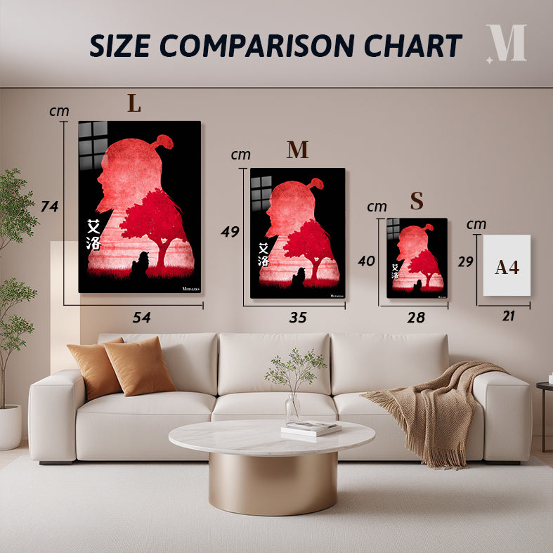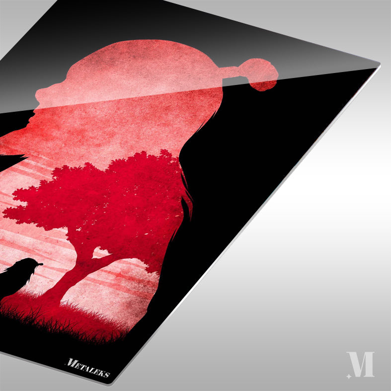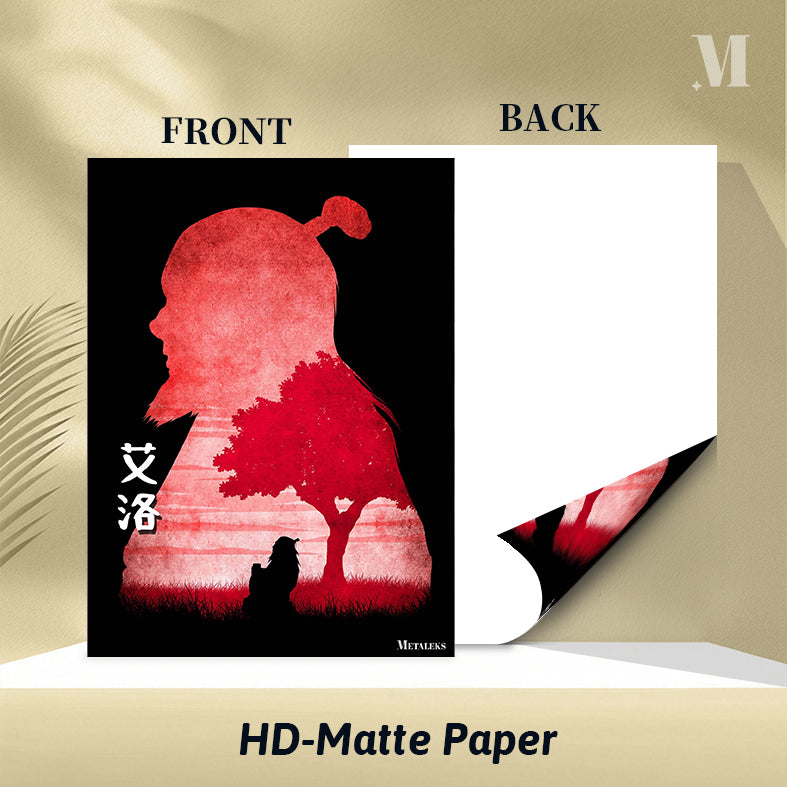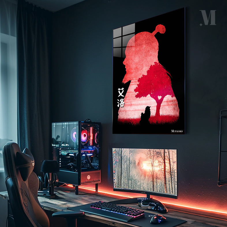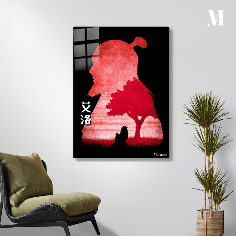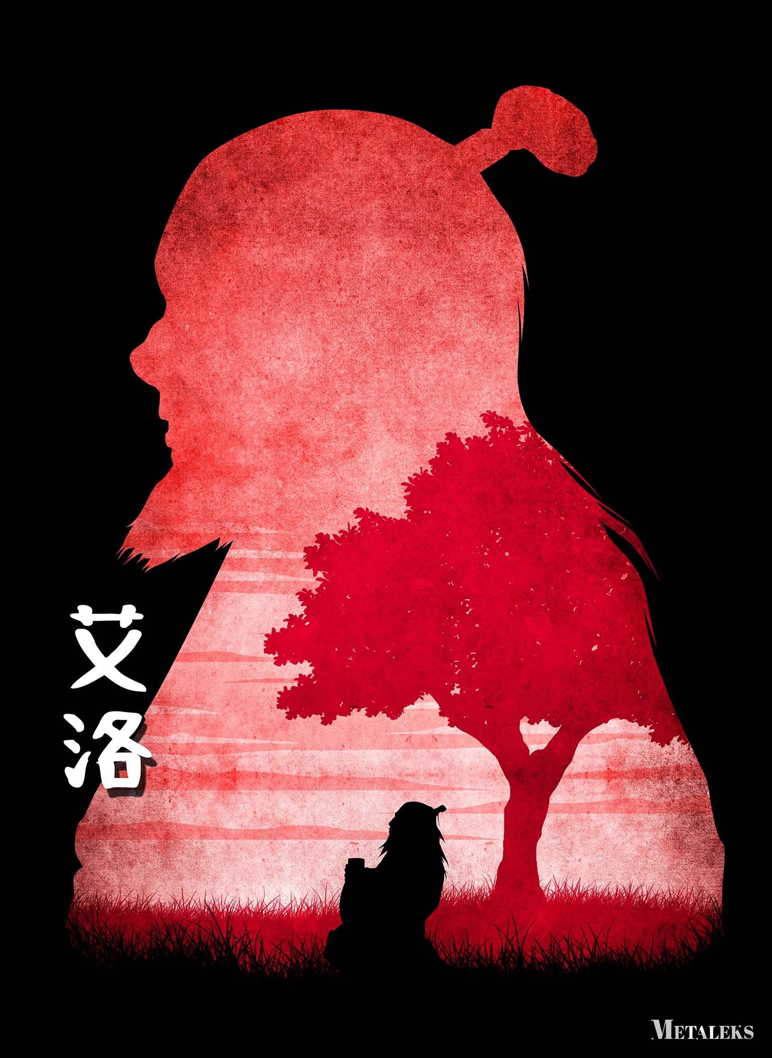 The image features a silhouette of a character with a topknot hairstyle. The character’s silhouette is filled with a red gradient, and within it, there is a red tree and a black silhouette of a person sitting under the tree. The name “艾洛” is written in white on the left side of the image. Metaleks Ultra HD Metal Poster – Create Your Passionate Space.