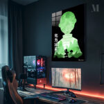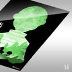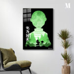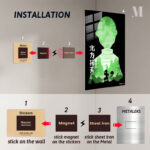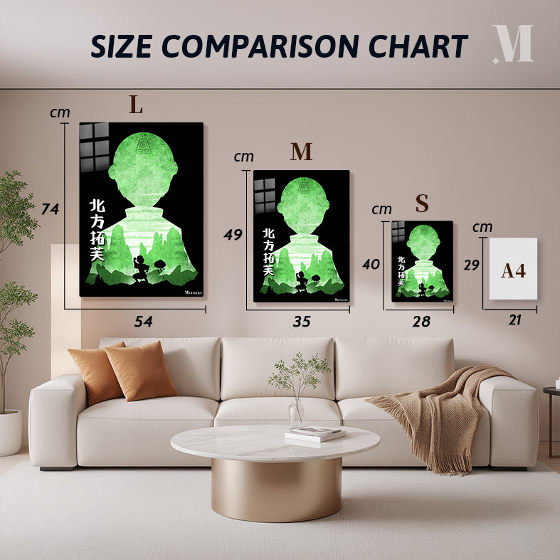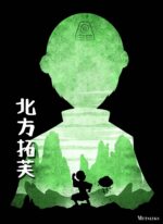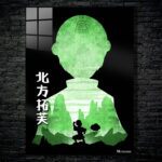 The image features a silhouette of a character with a green gradient background. The character has a shaved head with a spiral symbol on it. Below the character’s silhouette, there is a smaller silhouette of a child in a dynamic pose, seemingly throwing a rock. The text “北方拓芙” is written vertically on the left side of the image. Metaleks Ultra HD Metal Poster – Create Your Passionate Space.