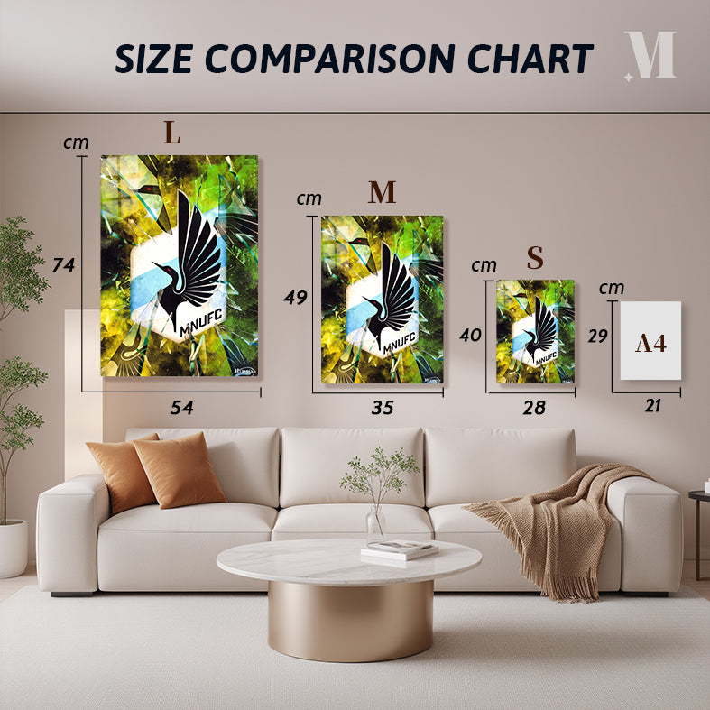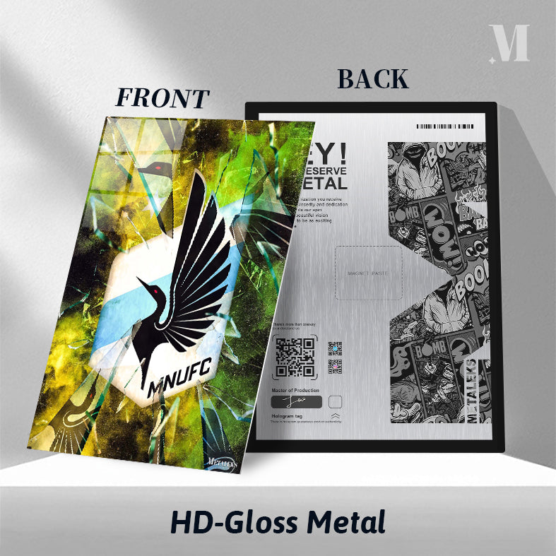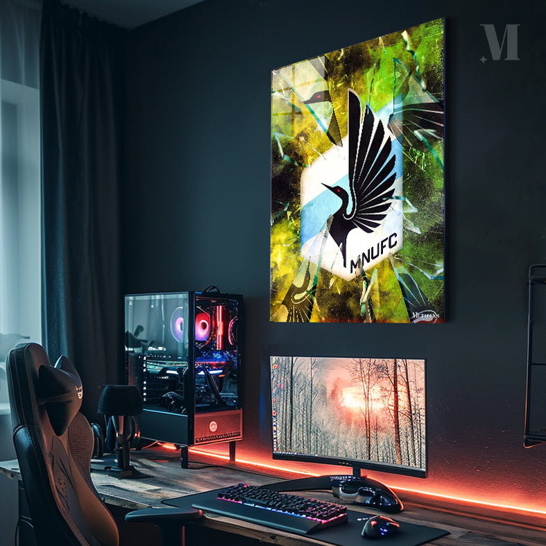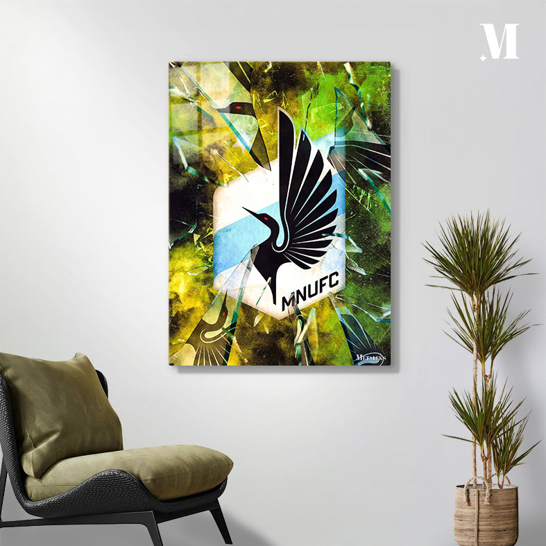 A black bird with red eyes and outstretched wings is featured in the center of a hexagonal logo. The logo has a blue stripe and the letters “MNUFC” below the bird. The logo appears to be shattered with fragments of glass surrounding it. Metaleks Ultra HD Metal Poster – Create Your Passionate Space.